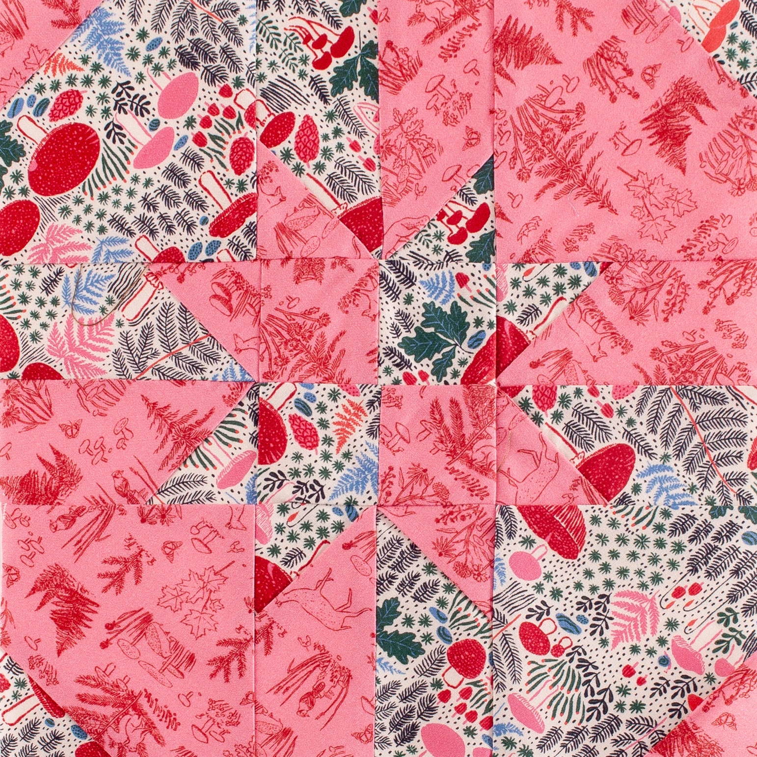 In this sewing tutorial, the block that I’ve made uses 2 printed fabrics from the ‘Autumn Walk‘ collection from Cloud 9 Fabrics. The fun mix of woodland-themed prints and bold pink adds a playful yet cosy vibe.
