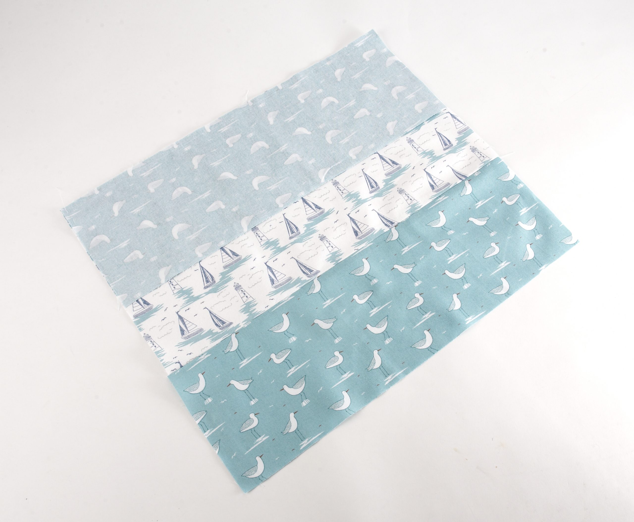 - Sew one of the smaller strips of fabric right sides together to the bottom of the bigger piece. Open and press.