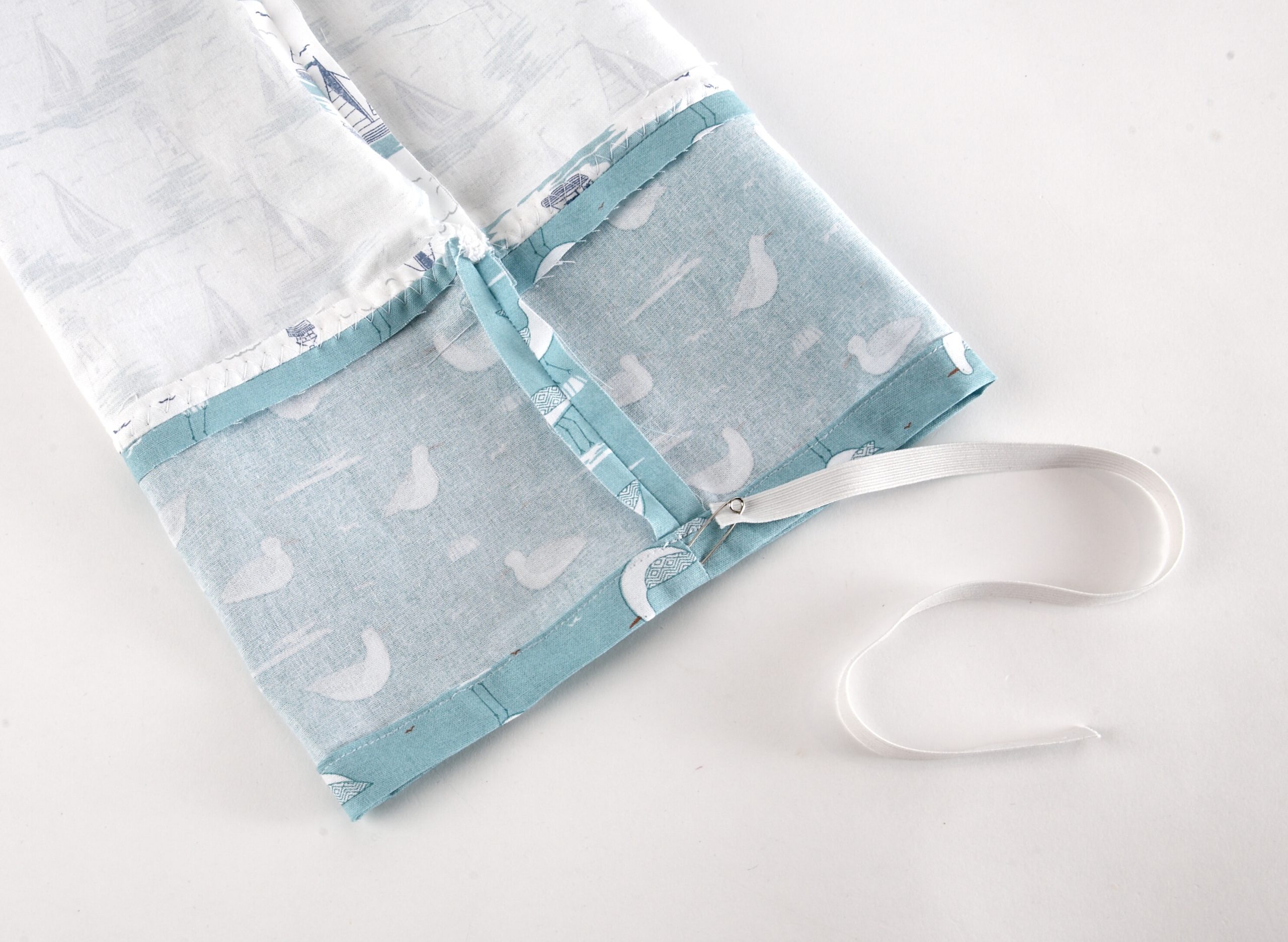 6. Unpick a few of the stitches in the hem. Push a safety pin through one end of the elastic and use it to thread the elastic through the bottom of the tube.