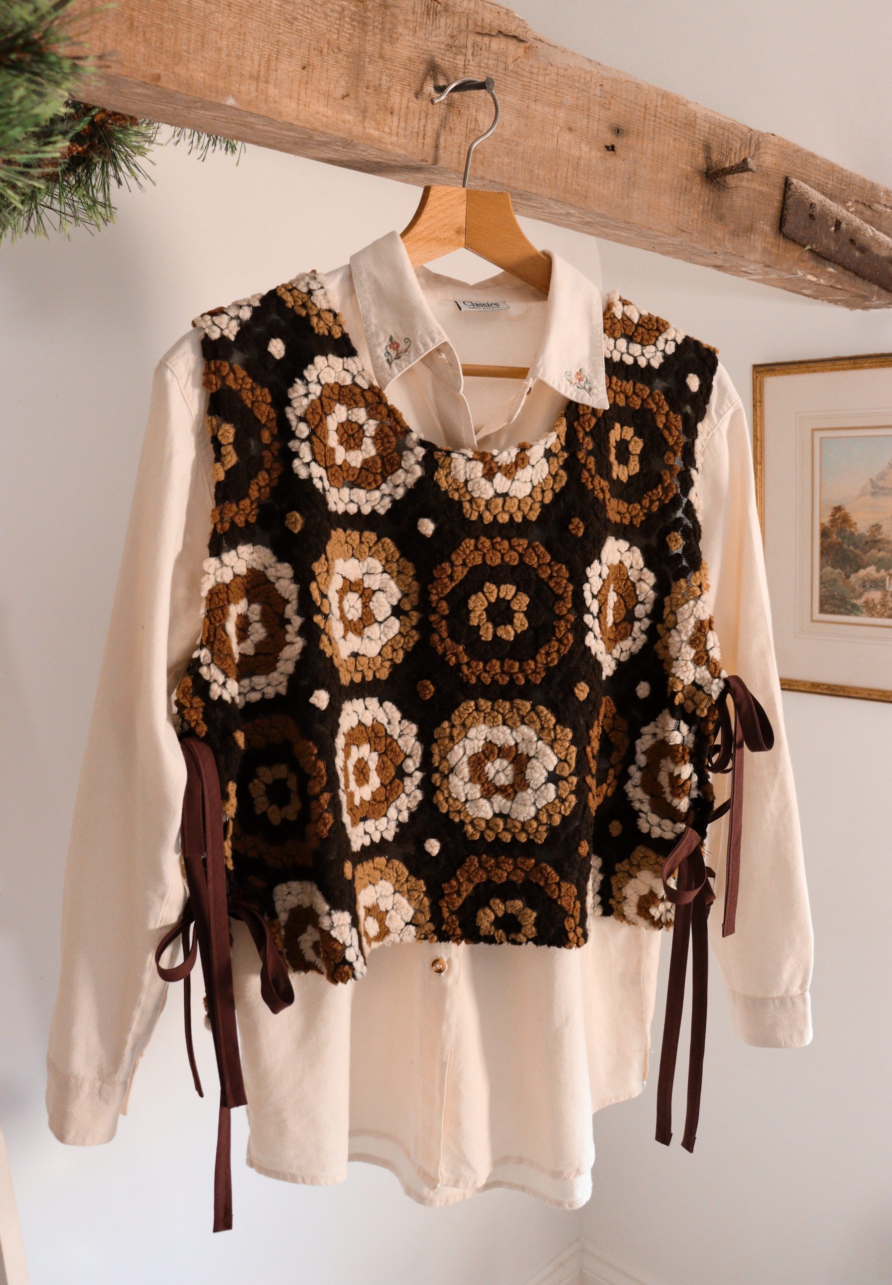 It is giving retro 70s fashion and I love how it turned out. I’ve layered my jumper over a vintage shirt I found on Vinted and it’s the perfect combo. The Batwing Top would be a great pattern to use as a base for this fabric, maybe going up a size because it isn’t a stretchy knit. I’ve got other plans for this fabric because I only used half a metre for this make! So, I’m thinking a cardigan next..