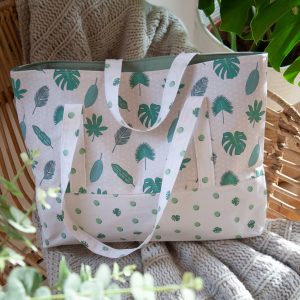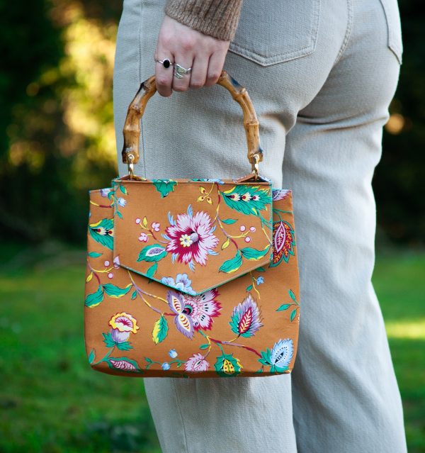 Although this pattern was designed to be made with the bamboo handle, it can easily be adapted to have a chain strap if you use D rings [3/4″ are ideal] or you could make a fabric strap instead. You’ll need an extra 20″ x 3″ of fabric for a fabric handle, fold the long sides to the centre then in half again and press, turn the raewedges inwards and sew to the top of the bag instrad of the tabs.
