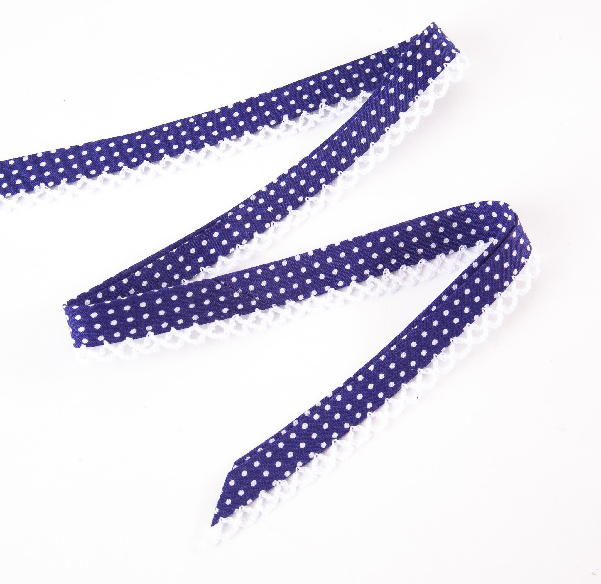 Bias Binding – 15mm Cobalt Blue Polka Dot Crochet-edged Poplin (per metre)