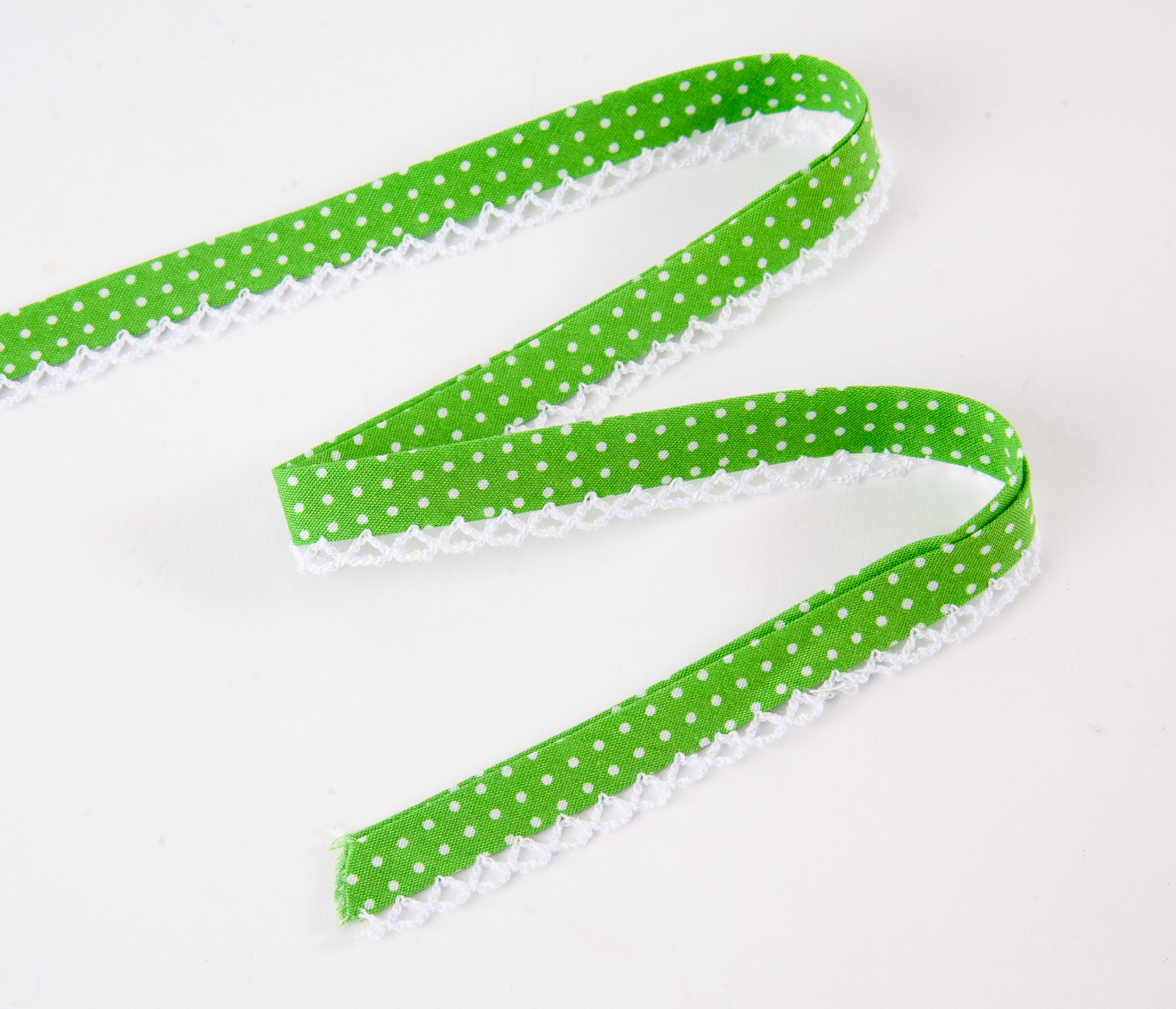 Bias Binding – 15mm Lime Green Polka Dot Crochet-edged Poplin (per metre)