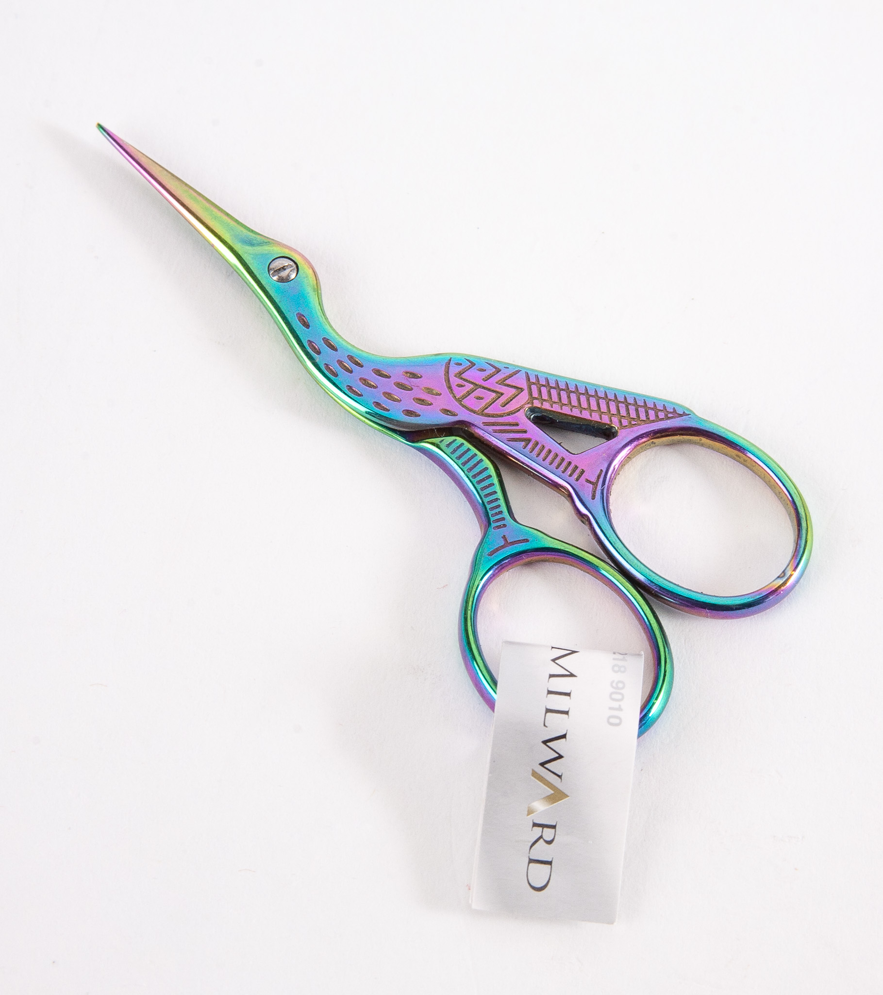 9cm/3.5in, stork shaped needlework / embroidery scissors. High quality steel construction for strength and long-lasting performance. Sharp pointed with straight edge, perfect for embroidery or needlework. rainbow-effect plasma coating.