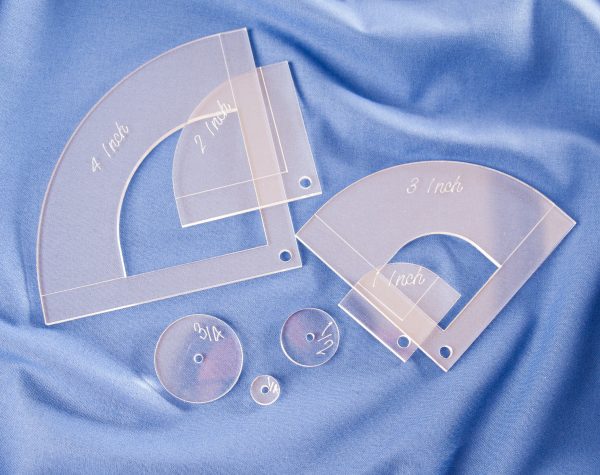 Create 1″, 2″, 3″ or 4″ corners on bag flaps or cushion covers with these handy templates, simply place the etched lines over the corner of your fabric and draw, or cut with a rotary cutter. The seam guides can make your template larger, place at the side of the template, pop a pen in the hole and roll around the shape. These can be used to enlarge or add seam allowances to your existing acrylic templates.