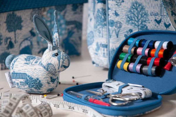 Sewing kit in zippered case made from 100% cotton fabric with appliqué design. Contains: seam ripper, scissors, tape measure, 3 safety pins, 6 shirt buttons, 12 reels of thread, thimble, 5 needles.