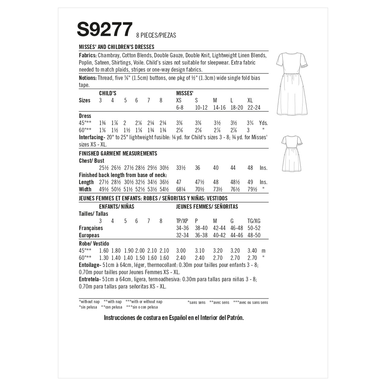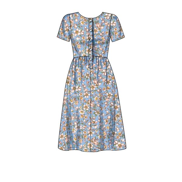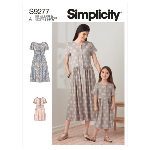Misses’ & children’s dresses with front buttons, sleeves with ruffle option & gathered skirts.