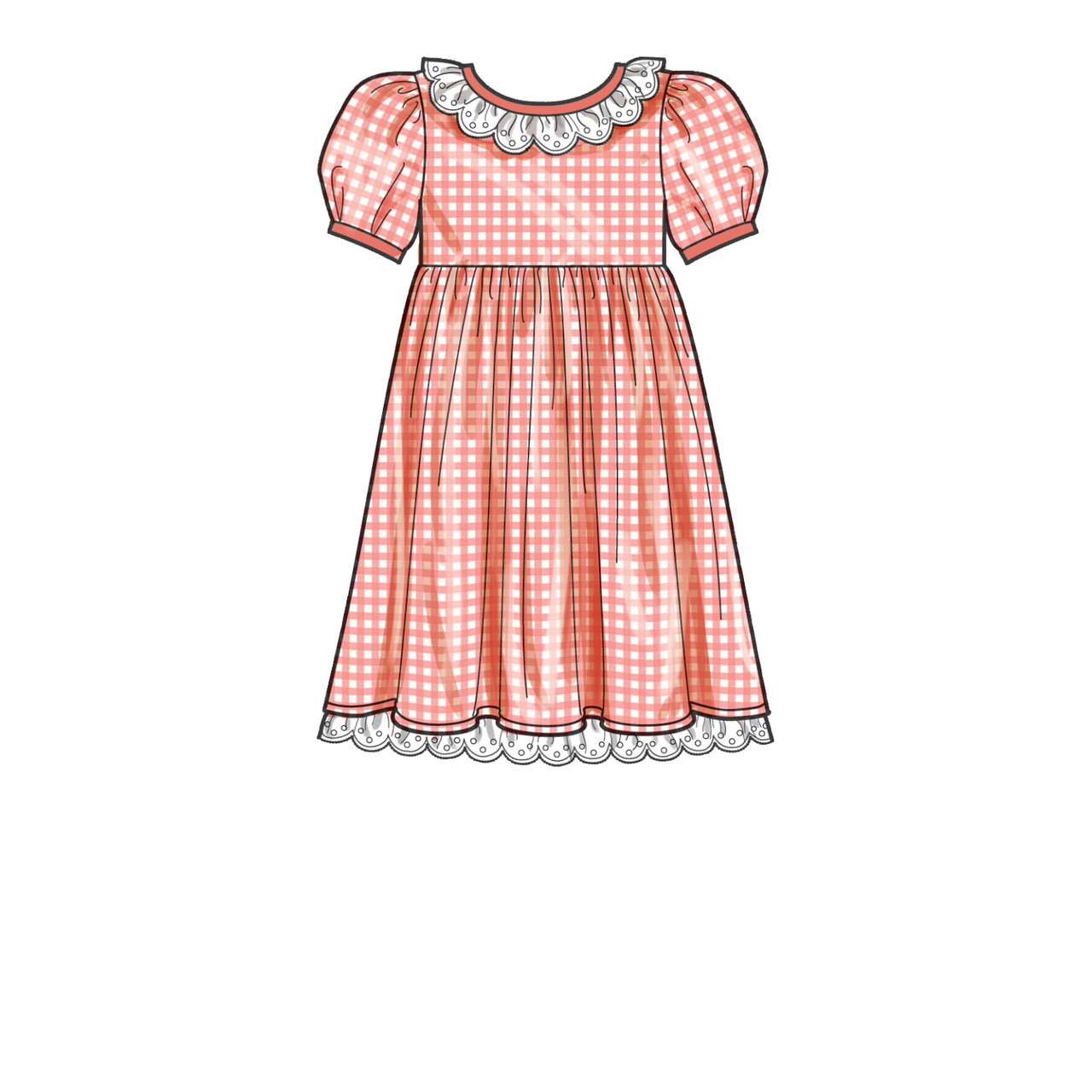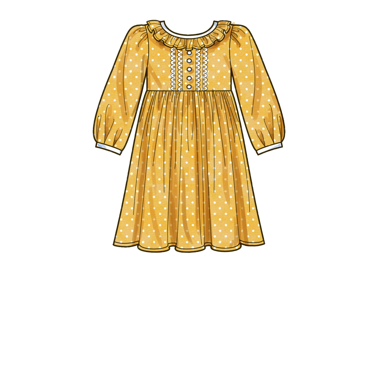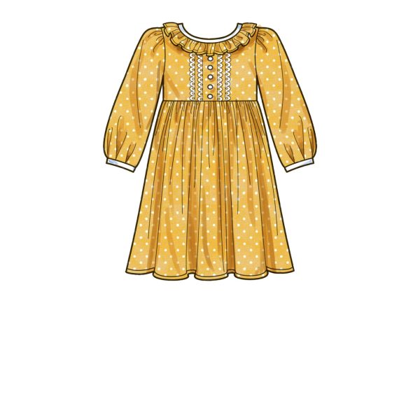 Ruffle collar details are featured on this raised waist dress with flared skirt. Zipper closure and long or short full sleeves are pleated to bias tape finish.