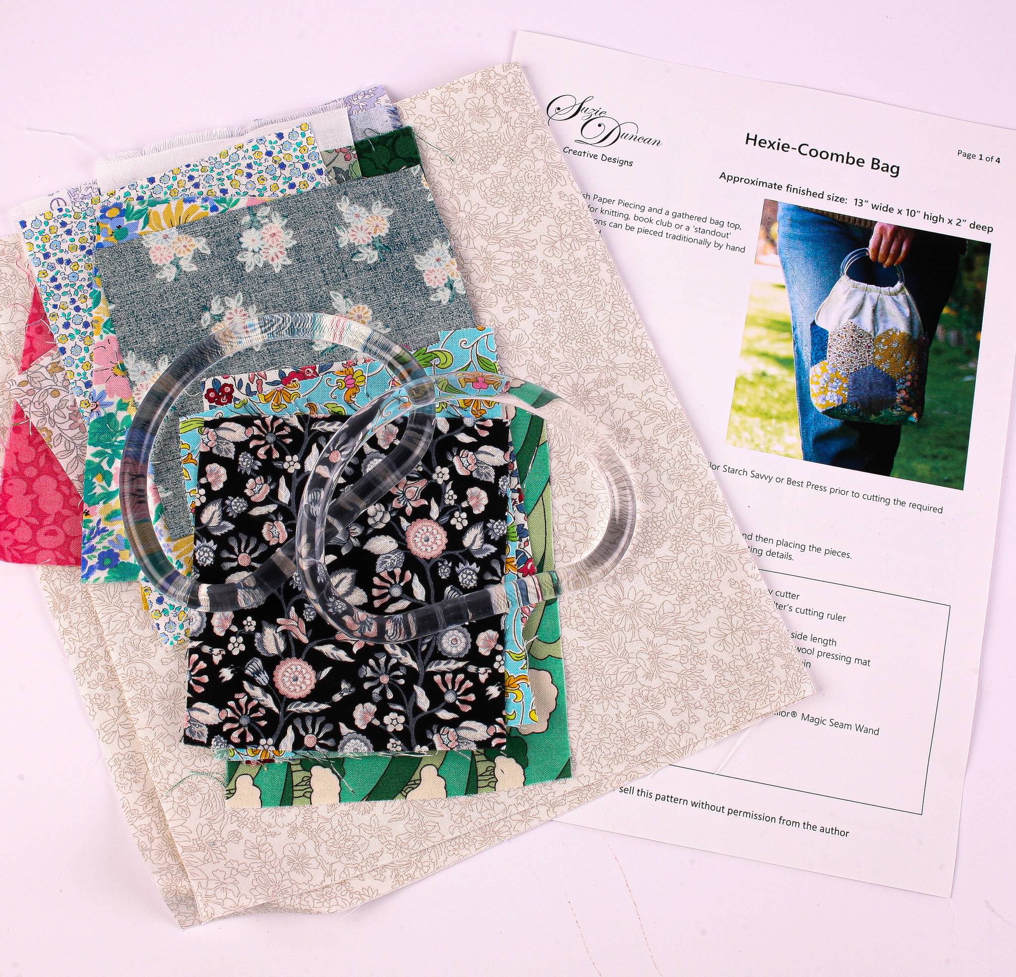 Combining EPP and a gathered bag top, handles included. Finished size: 13″ x 10″ x 2″