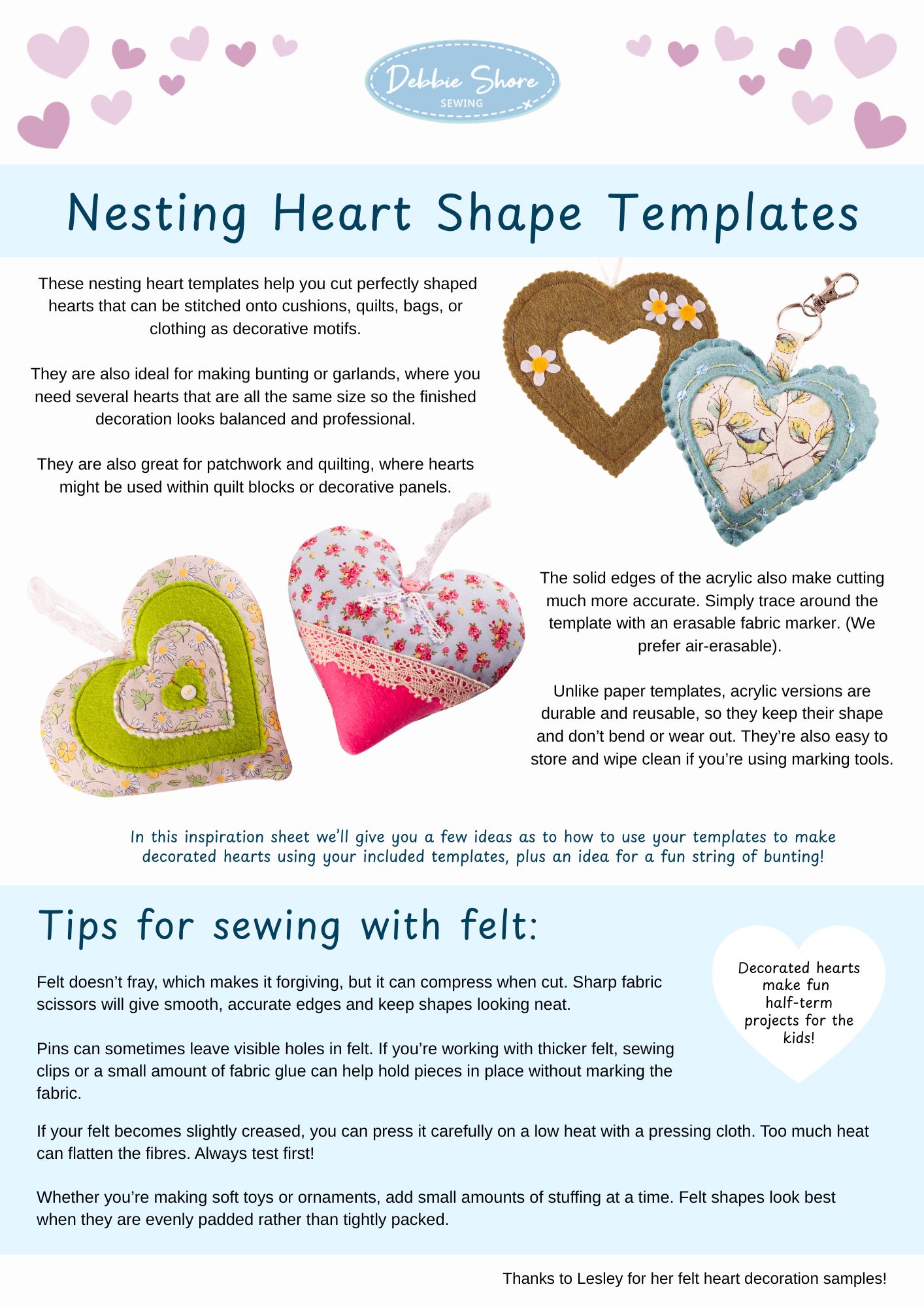 In this inspiration sheet we’ll give you a few ideas as to how to use your templates to make decorated hearts using your 90 degree heart templates, plus an idea for a fun string of bunting! Heart templates not included, this sheet is for use with the acrylic templates you have already purchased.