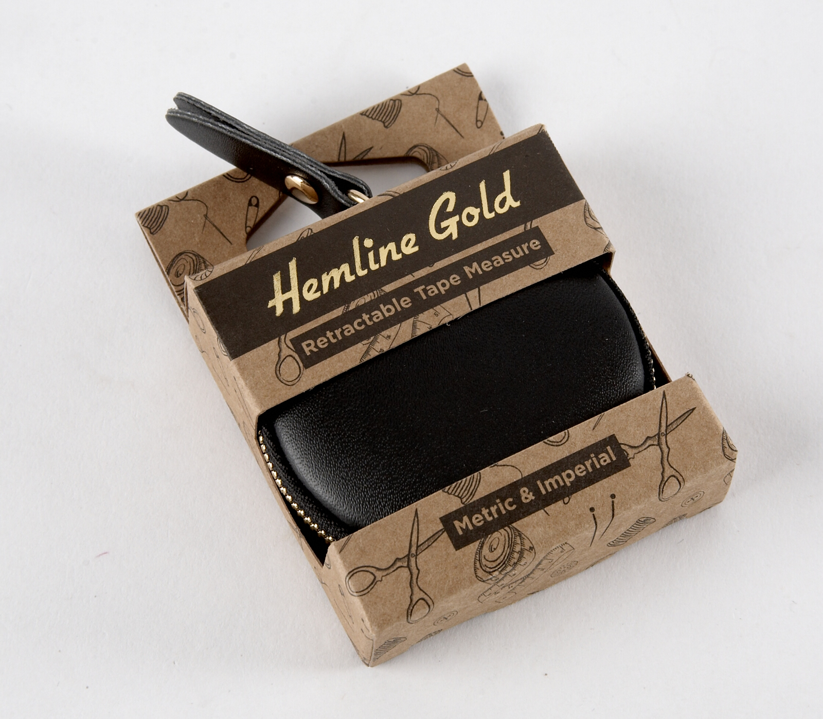 Premium quality, retractable, double-sided tape measure featuring metric and imperial measurements. Sleek black faux leather cover and end pull, with gold zip and stud detail. Durable spring. A sewing kit essential that is perfect for all hobbies. Wipe clean only. Dimensions of tape measure case: 55 x 55 x 20mm. Tape measure length: 150cm.