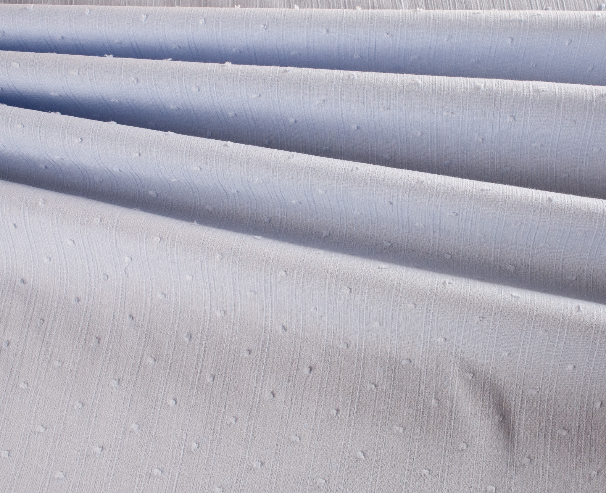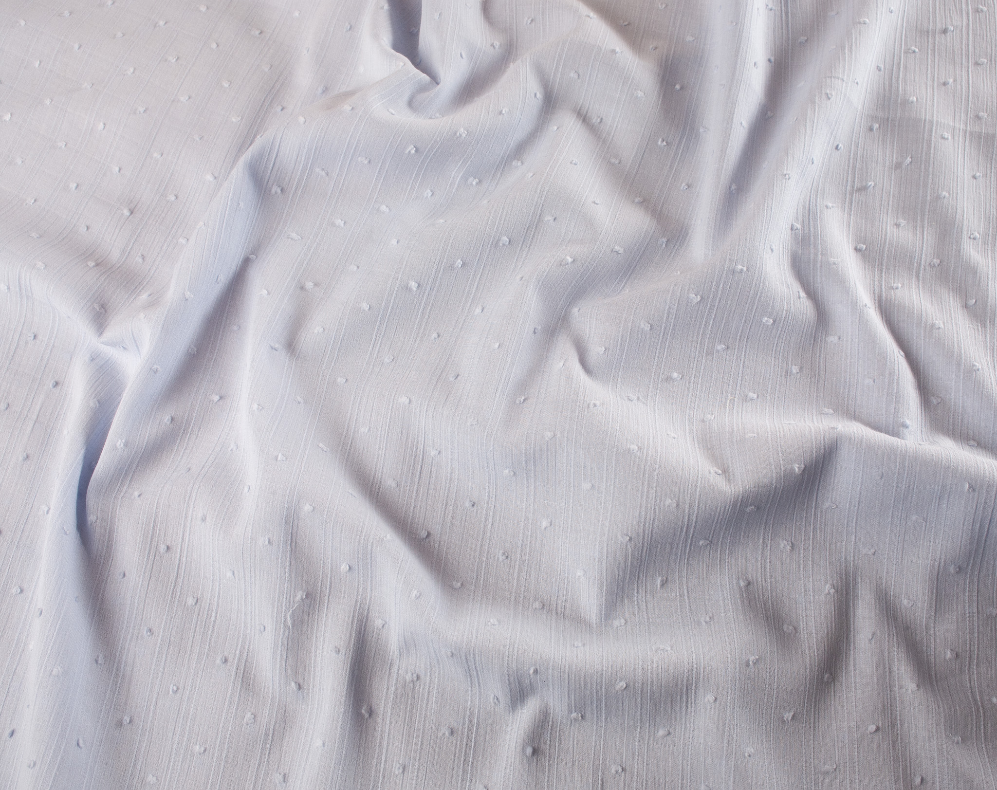 A lightweight dressmaking cotton fabric with dobby spots throughout. lovely for summer sewing projects. This fabric is slightly see through so you may wish to use a lining.