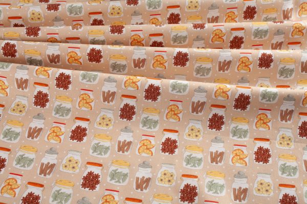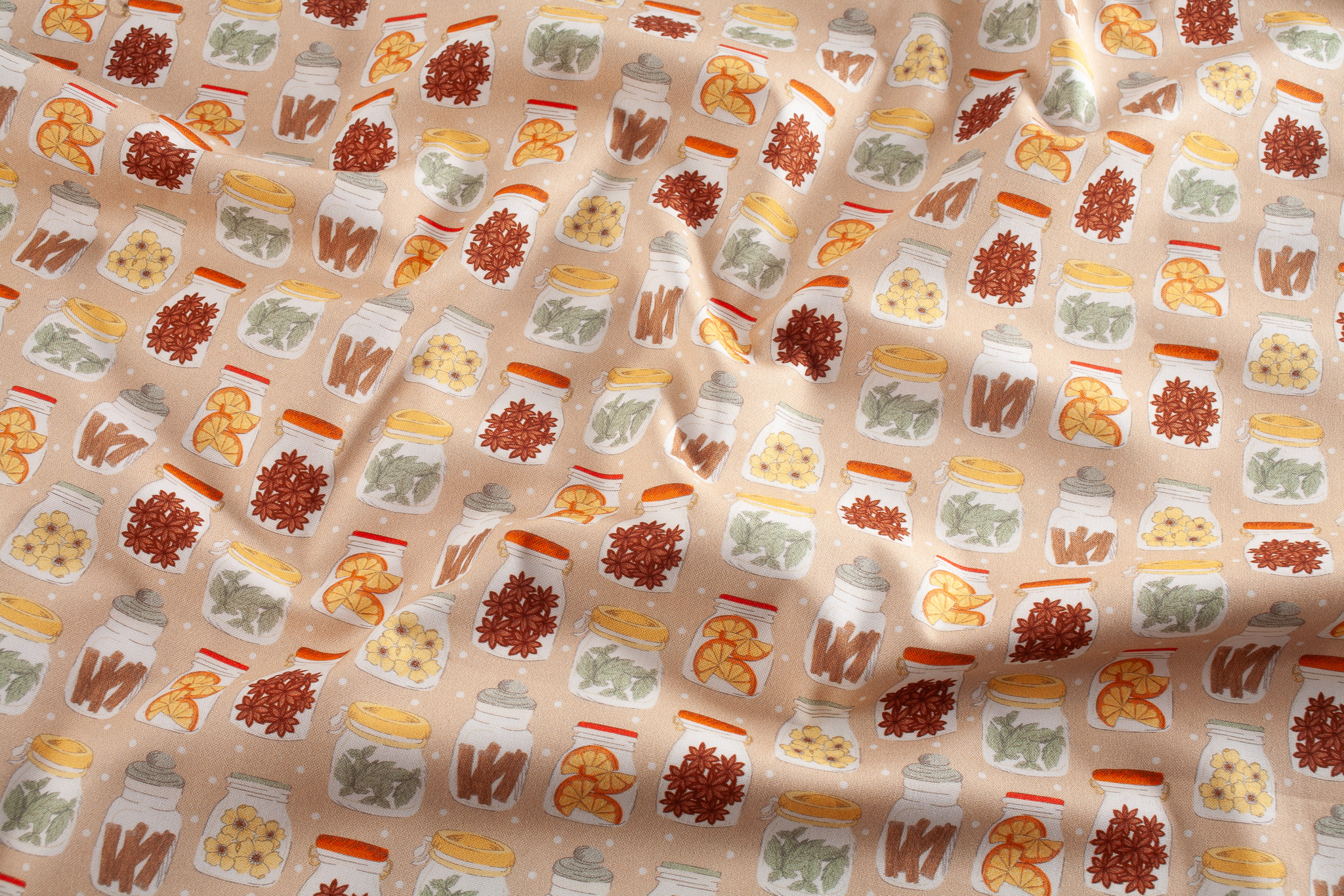 The Cinnamon Spice fabric collection by Kimberley Hind captures the warmth and cosiness of autumn with rich, earthy tones and charming, hand drawn motifs. Featuring sunflowers, clementines, tea-time elements, and homemade potpourri-inspired jars, each design celebrates the season’s comforting aromas and visuals. The collection includes prints with deep greens, browns, and soft greens, paired with suggested complementary shades like moss and ochre, and making it ideal for fall-inspired projects.