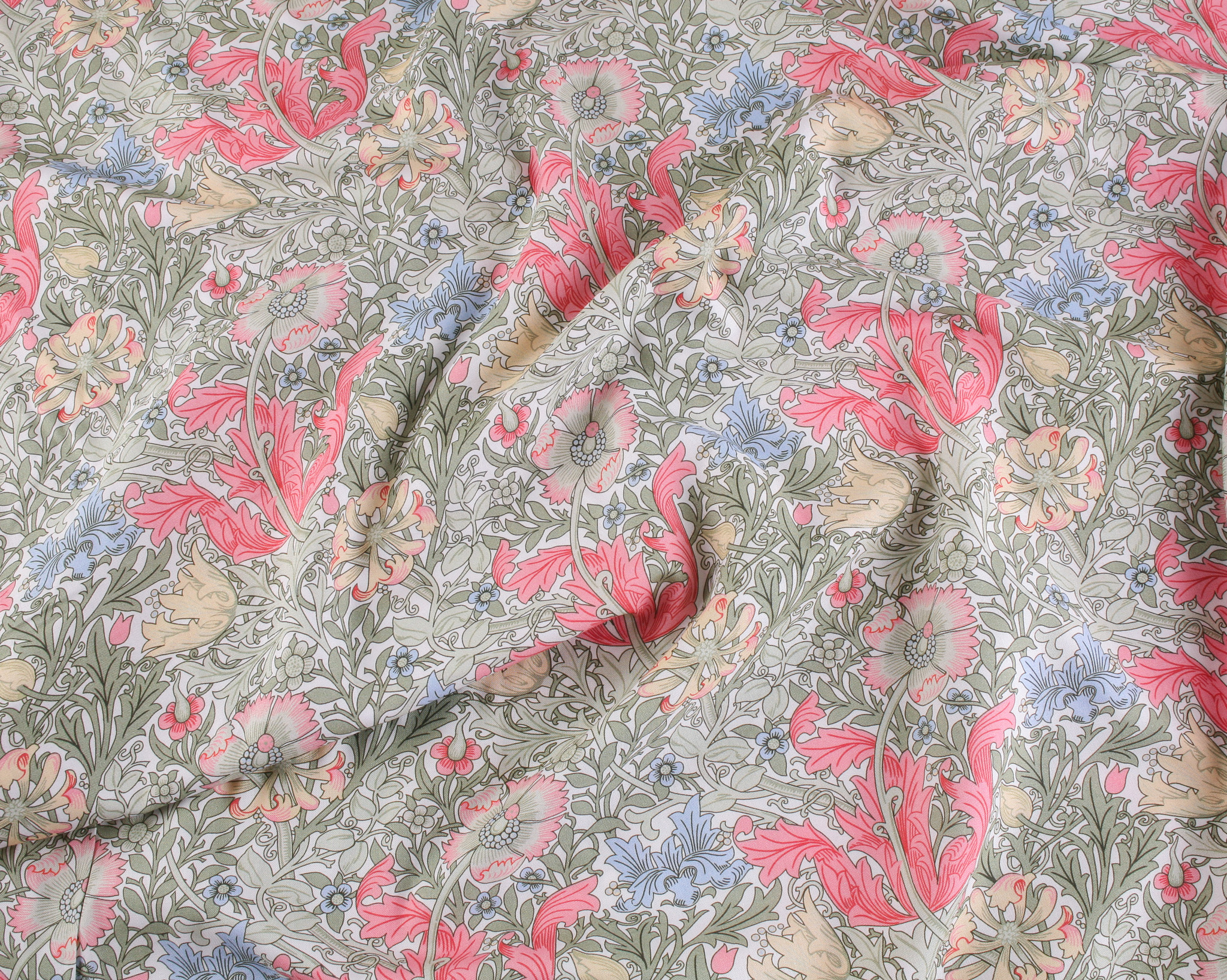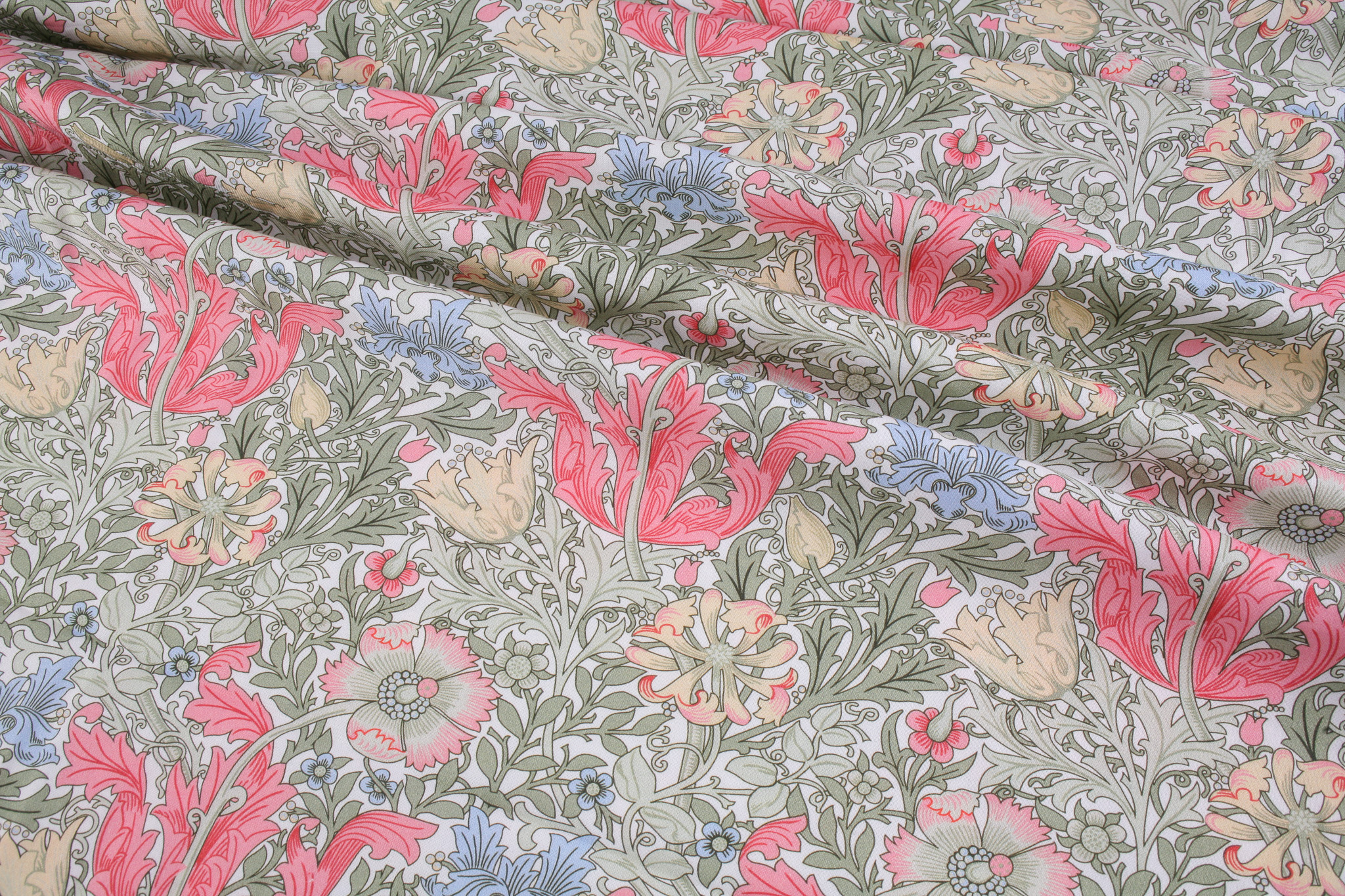 A stunning dressmaking fabric by The Craft Cotton Company featuring the classic William Morris design ‘Compton’ in soft tones of green and pink.