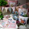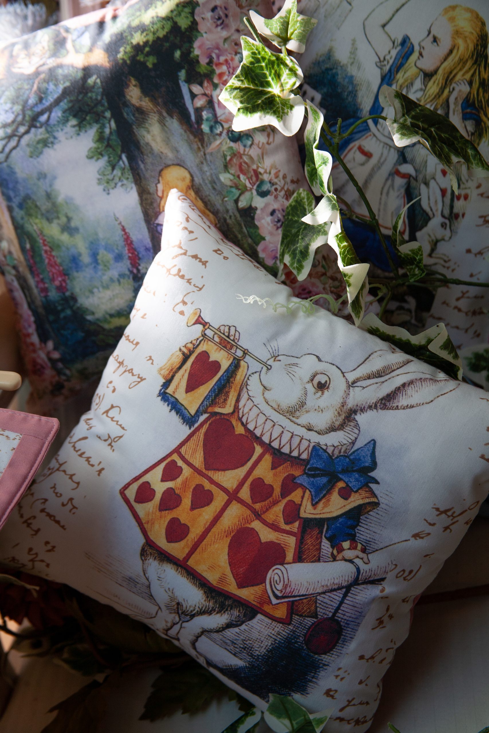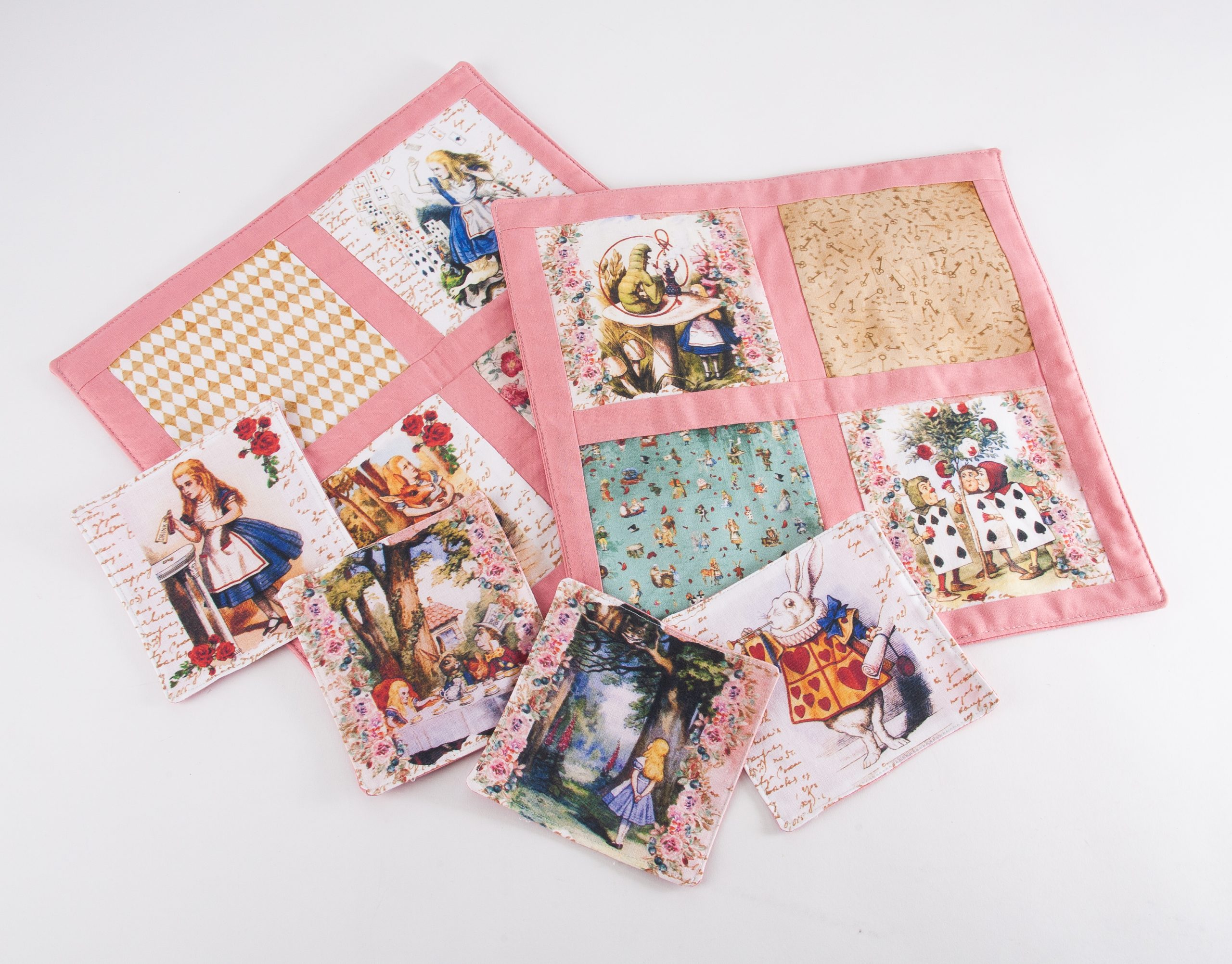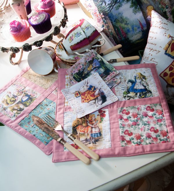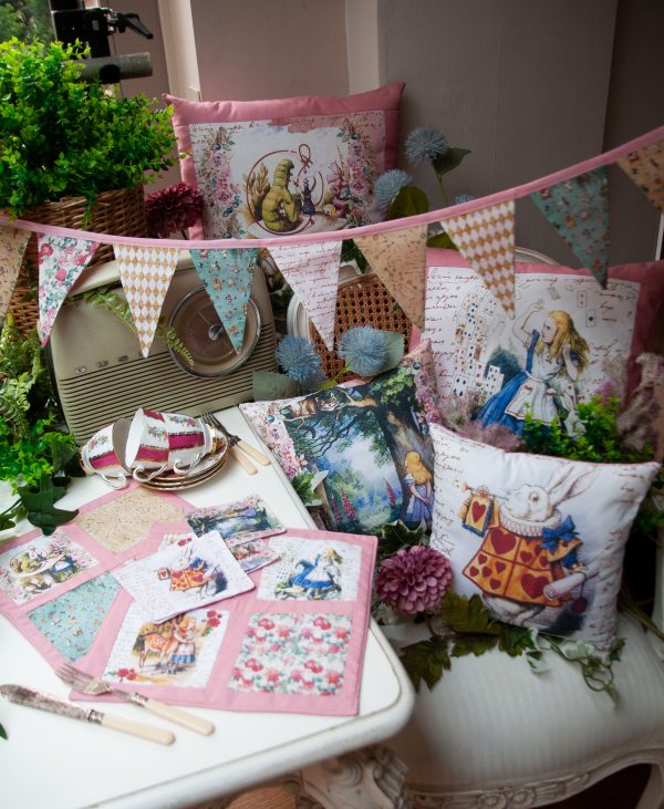 Using the Wonderland fabric panel, these istructions are to make a small cushion with invisible zip, finished size is 11.5″ square, plus coasters and placemats, then a larger cushion cover with border and invisible zip, finished size 16″ square, plus bunting.