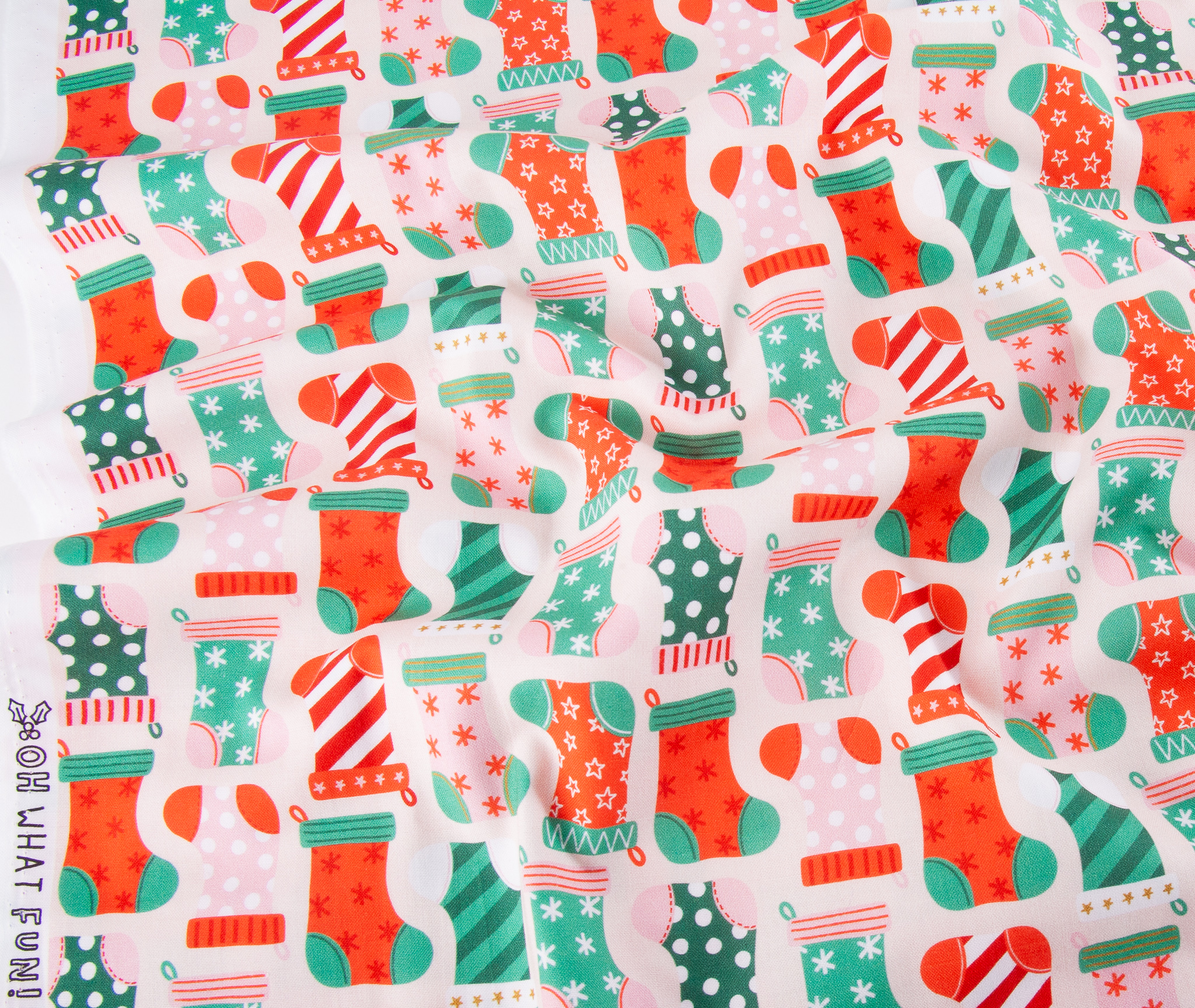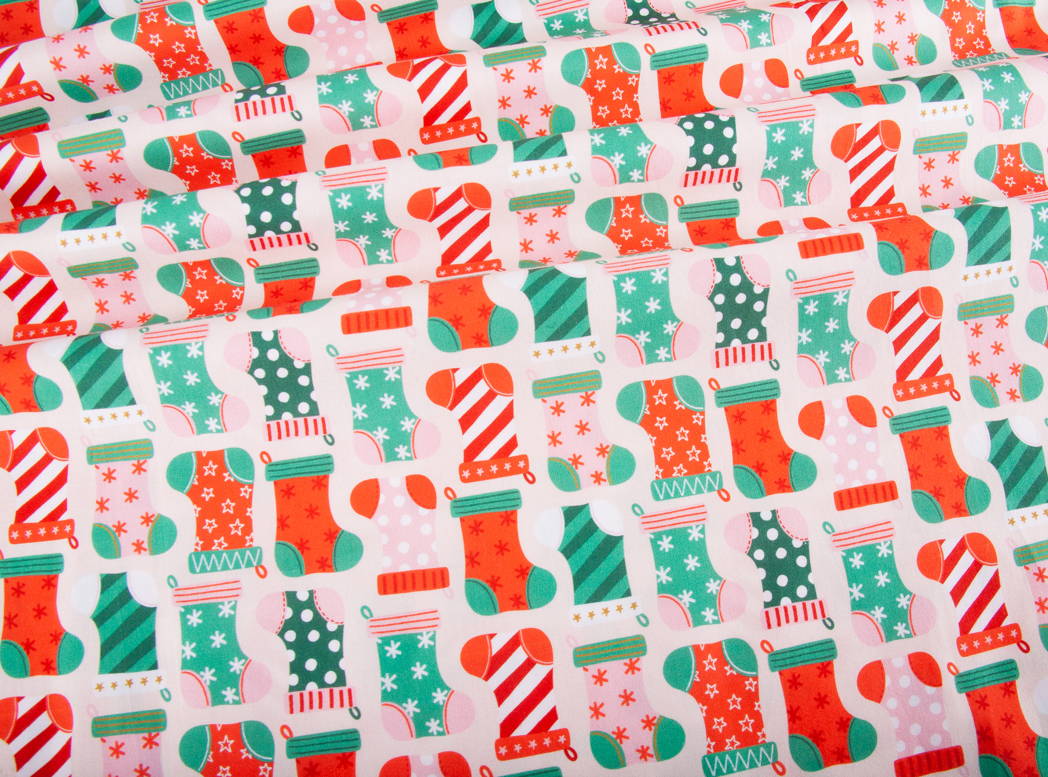 This cute, festive fabric features colourful stockings on a cream background. Great for Christmas crafts such as stockings, gift bags and much more!