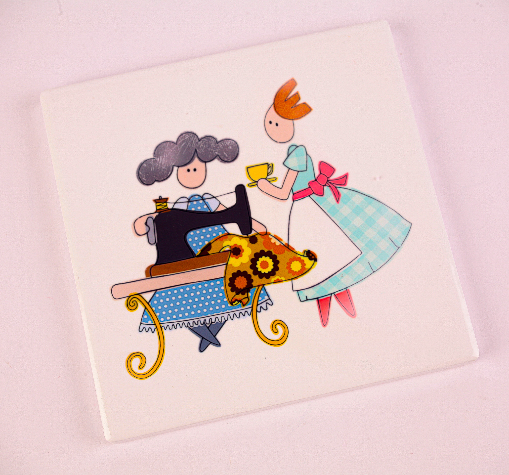Here’s Pearl bringing a cuppa for Ceramic coaster, one unit, 4″ x 4″.