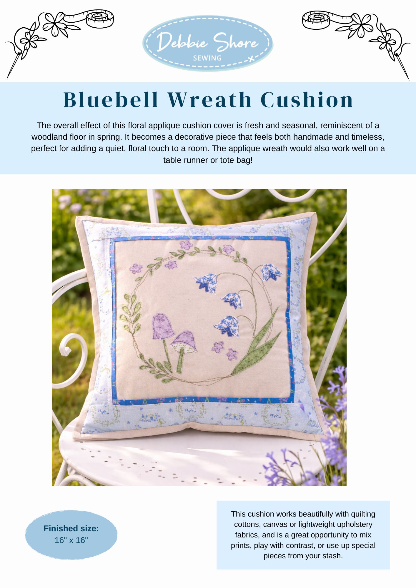 The overall effect of this floral applique cushion cover is fresh and seasonal, reminiscent of a woodland floor in spring. It becomes a decorative piece that feels both handmade and timeless, perfect for adding a quiet, floral touch to a room. The applique wreath would also work well on a table runner or tote bag!