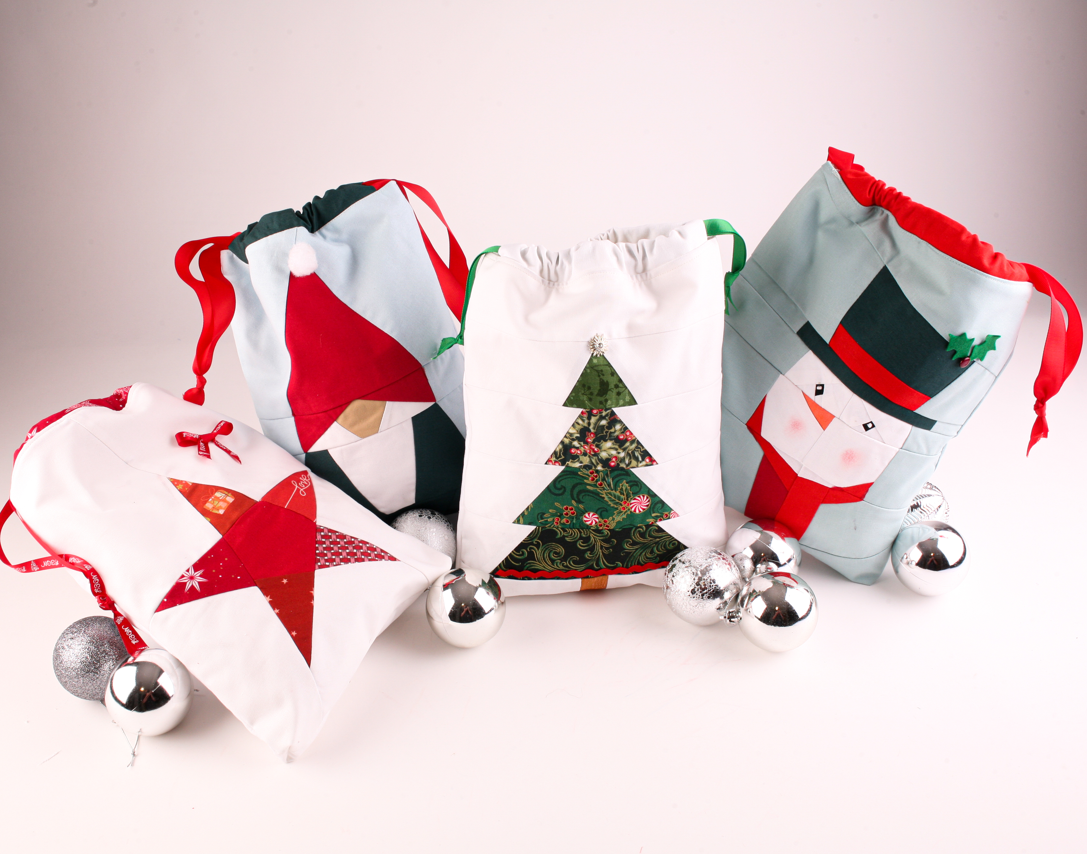 This panel creates four foundation pieced blocks that are designed to be made into gift bags, but would also make cute table settings! No paper involved, full instructions included.