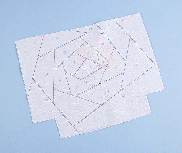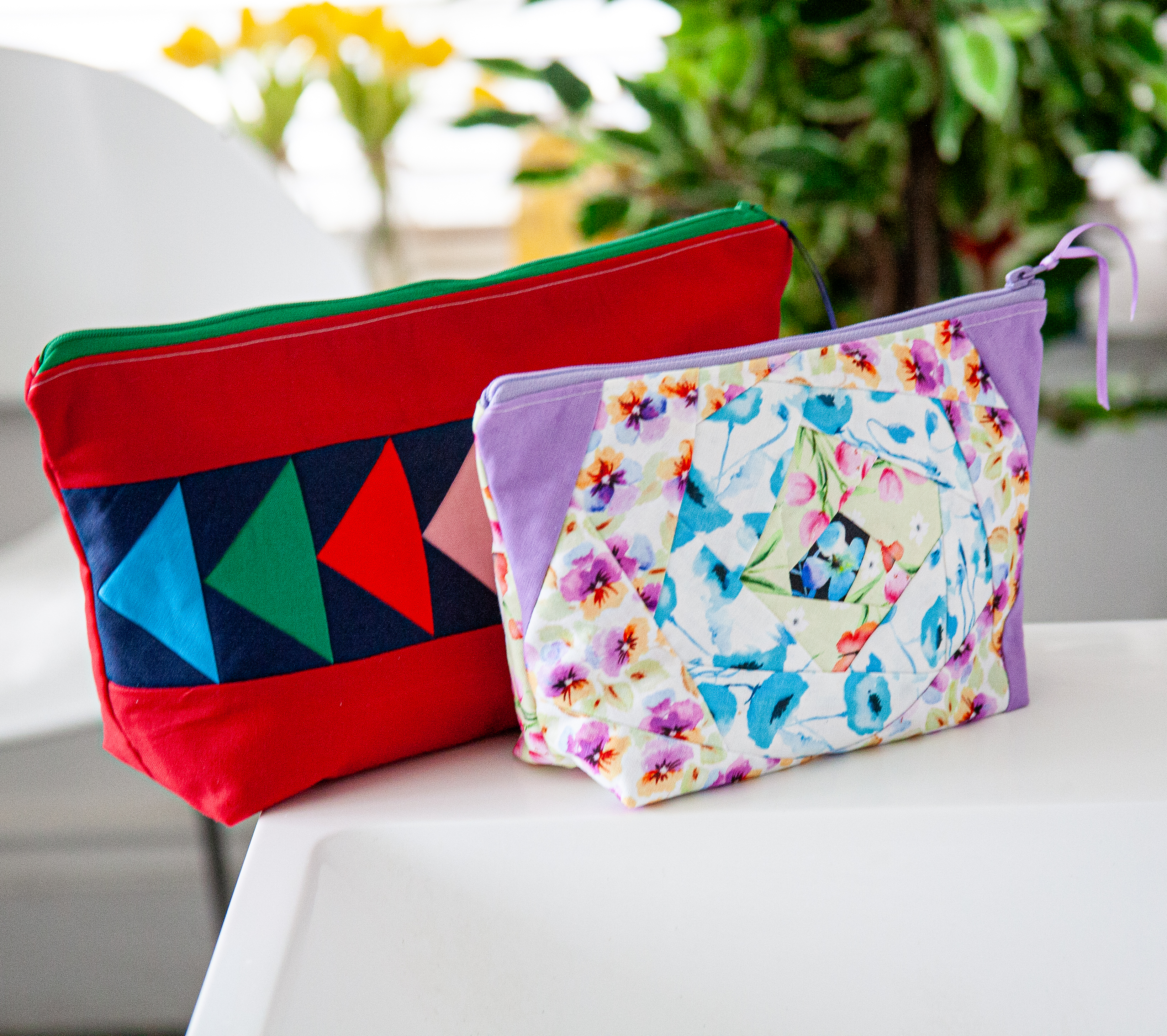 This way of piecing fabrics needs no paper. The interfacing stays on the back of the fabric, making it a simple way of creating beautiful pieced designs that make up two zipped pouches.
