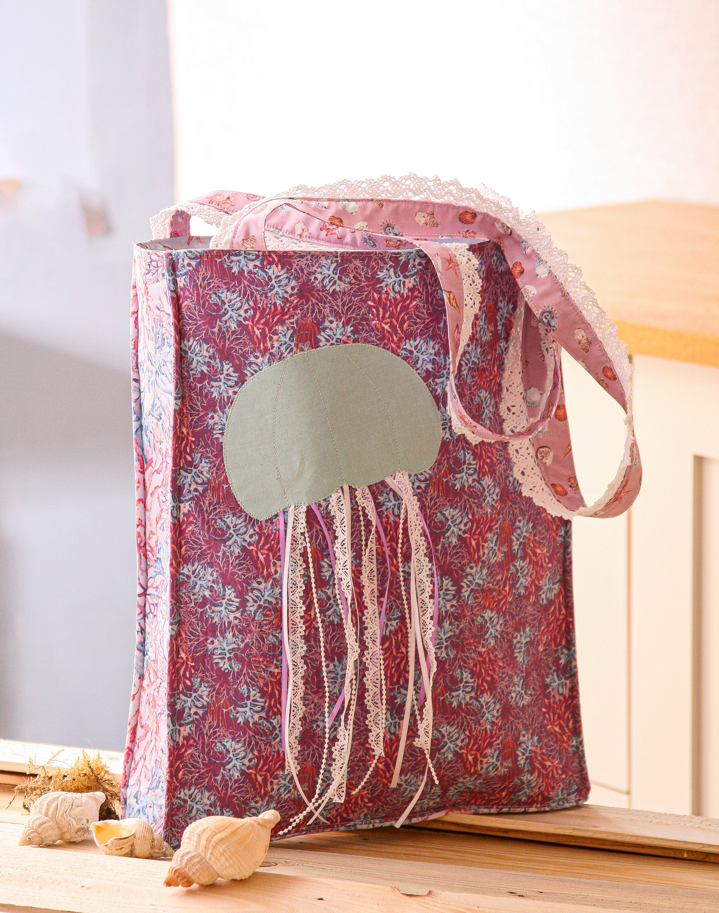 This roomy tote bag is great for every day use or weekends away. The simple design makes it practical and it has a patch pocket on the inside to keep smaller items organised. The jellyfish applique adds some fun to the tote, using embellishments such as ribbon and lace to create the tentacles.