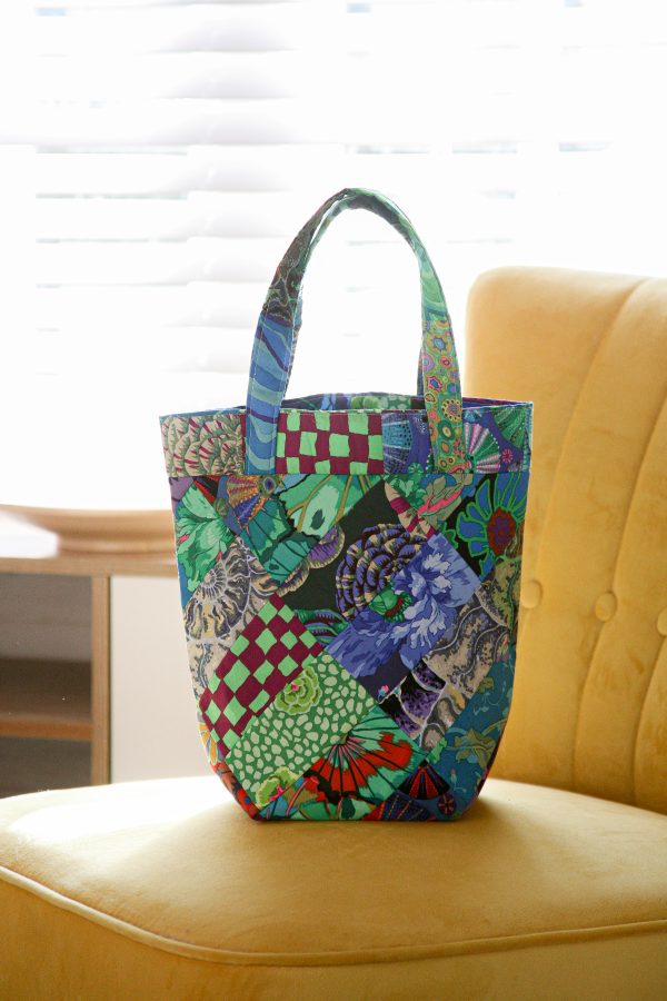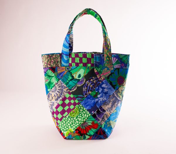 This fun bag is great for everyday, and could also be used for storage. The unusual twisted design creates quite a talking piece! Made from 5″ squares, it’s a great way to use up those small pieces of fabric you just didn’t know what to do with!
