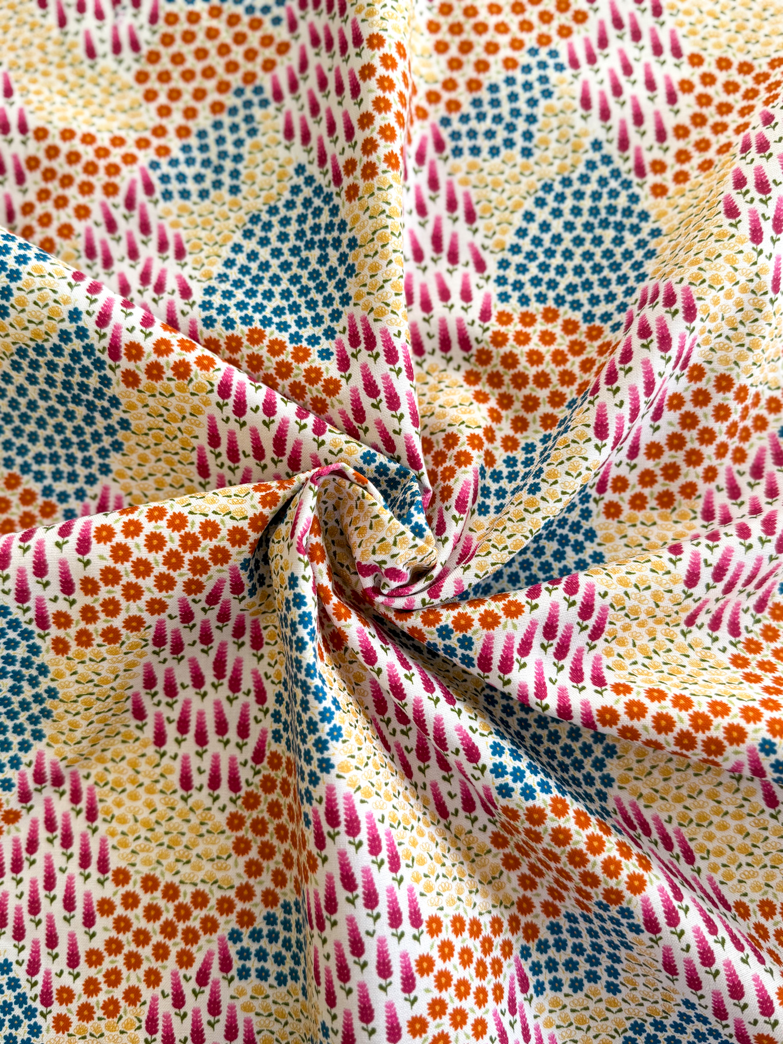The palette is vibrant yet comforting, bringing together warm golds, midnight blues, soft pinks and earthy greens to capture that feeling of settling in for an evening of making. Small-scale designs and playful repeats make the collection versatile for quilting, accessories and smaller projects where detail really shines.