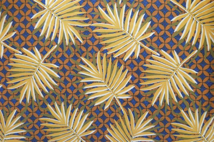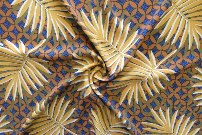A Stunning Tropical Palms Viscose Challis Lawn Digital Print In Tones Of Terracotta, Royal Blue, Ochre Lime, Khaki And Ivory