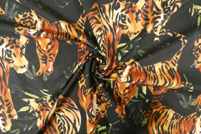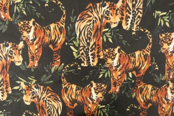 A Stunning Cotton Marlie-Care Lawn Digital Tiger Print in Natural Tones on a Black Background