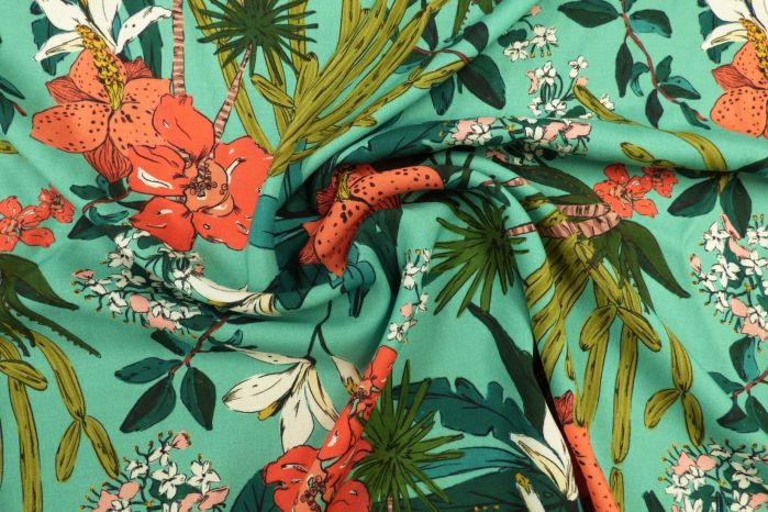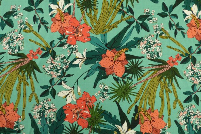 A Lovely Spun Viscose Soft Challis Lawn Digital Print in Aqua, Coral & Teal Tones