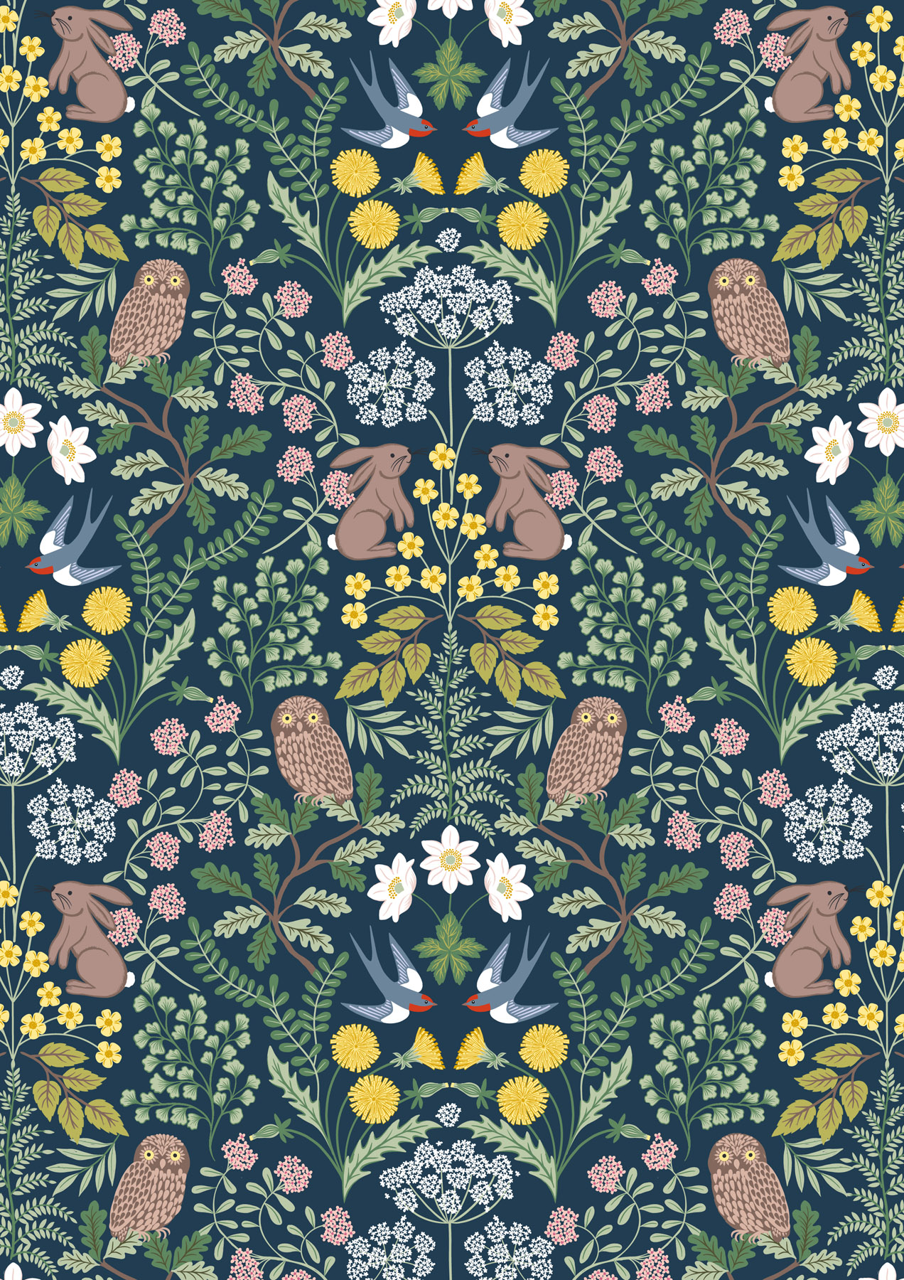 Inspired by the countryside and chalky downlands near our homes. Frothy hedgerows full of cow parsley, swaying in the breeze. Bees buzzing in the wild flowers while swallows swoop low. Trees with birds singing and countryside creatures playing on the edge of the copse. A double edge border is a pretty addition to this delightfully rural collection.