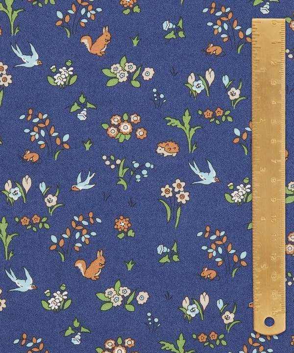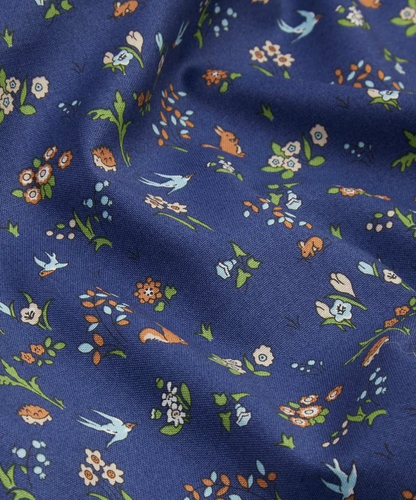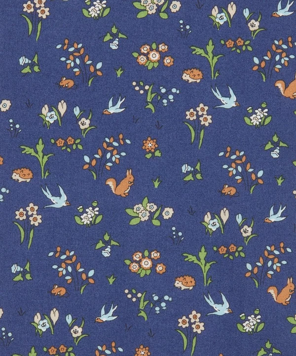 Forest Friends was inspired by an archival paper impression dating from 1927 and edited in the Liberty Design Studio with the addition of adorable woodland animals. Spot the tiny squirrels, hedgehogs, mice, and birds as they play hide and seek amongst the scattered sprays of leafy tufts and ditsy flowers.