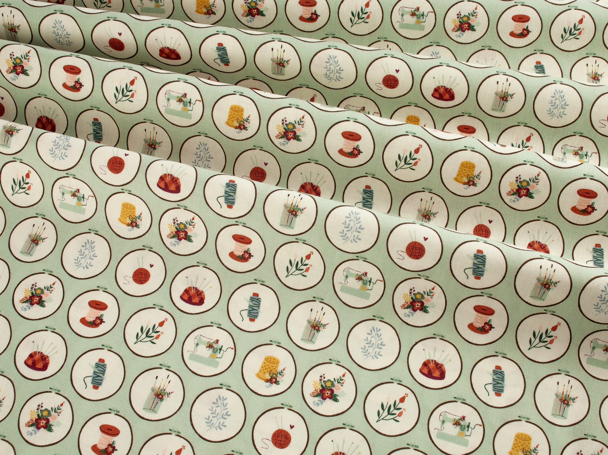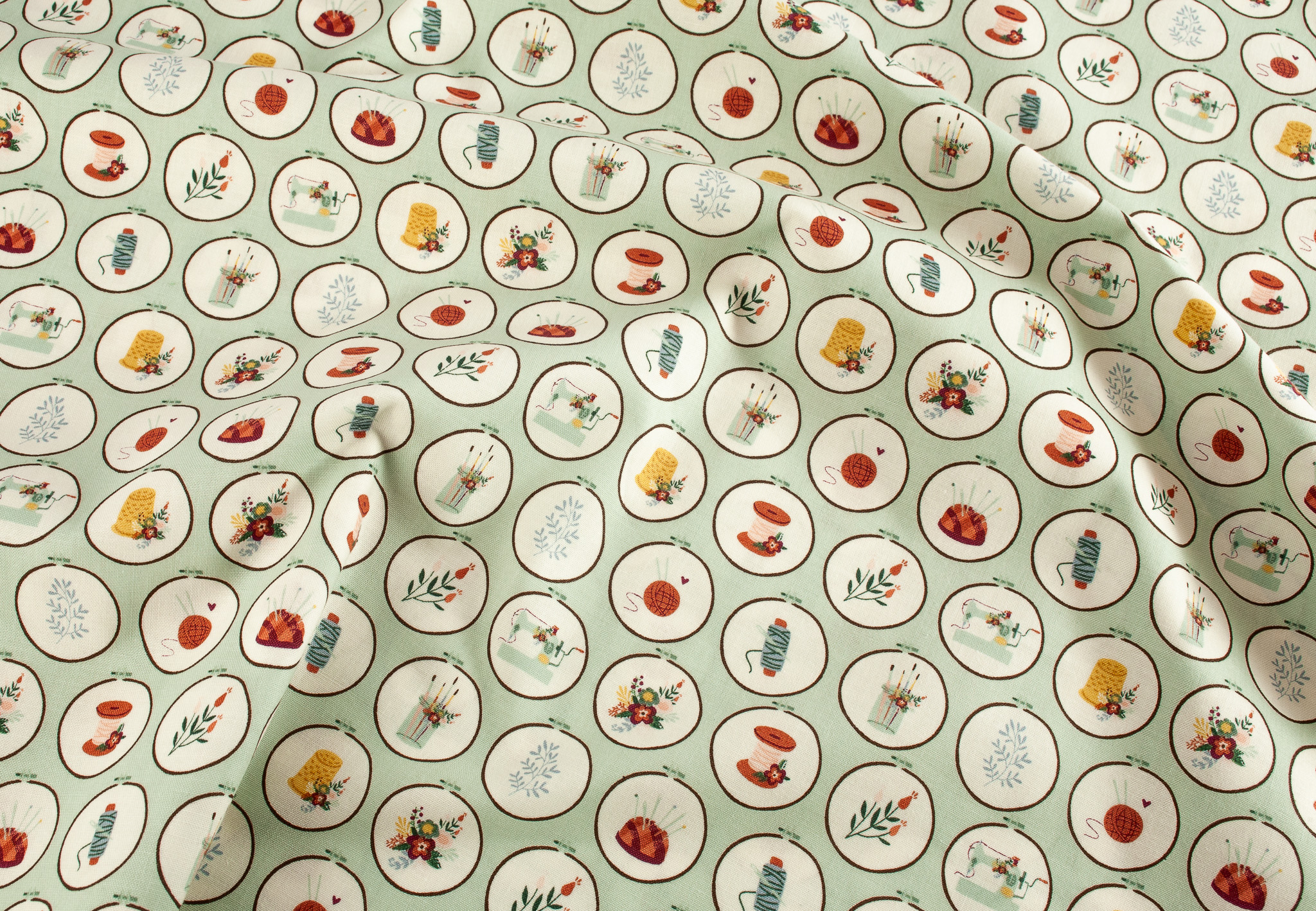 Let’s Create by Echo Park Paper Co. for Riley Blake Designs is great for quilting, apparel and home decor. This print features rows of embroidery hoops filled with crafting-themed icons.