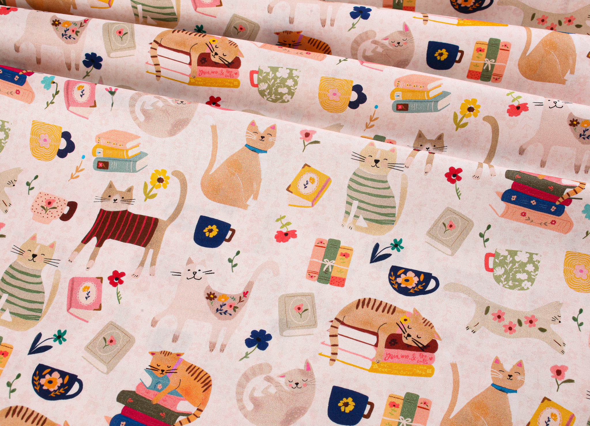 This delightful 100% cotton quilting fabric features a charming, story-inspired design of cats curled up among stacks of books, framed by steaming coffee cups and pretty floral accents. The whimsical print evokes lazy mornings with a good read and a cuppa – perfect for anyone who loves cats, coffee and cosy vibes.
