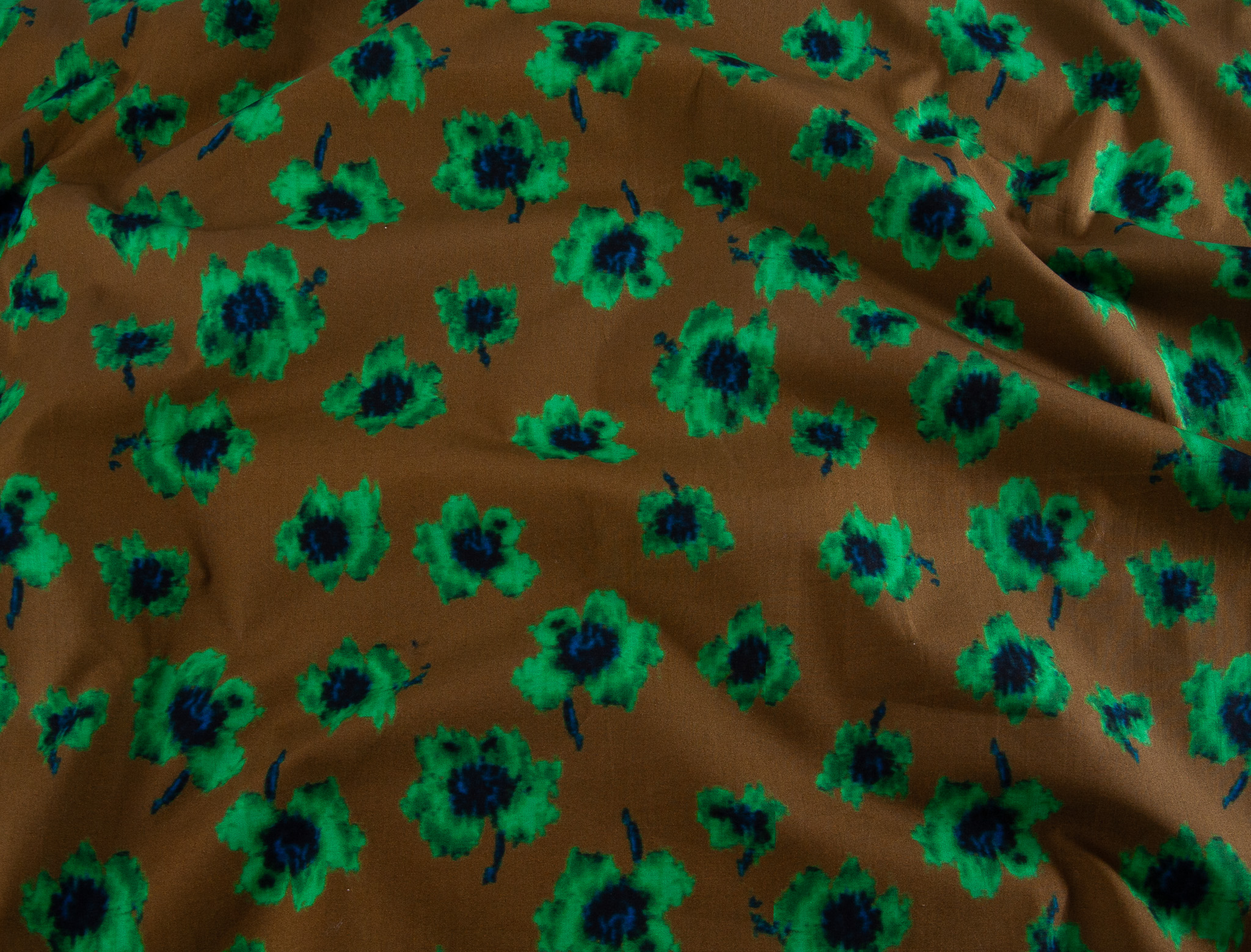 dressmaking cotton fabric featuring digitalized flowers on a vintage olive green background. Perfect for structured garments or homewares and craft.