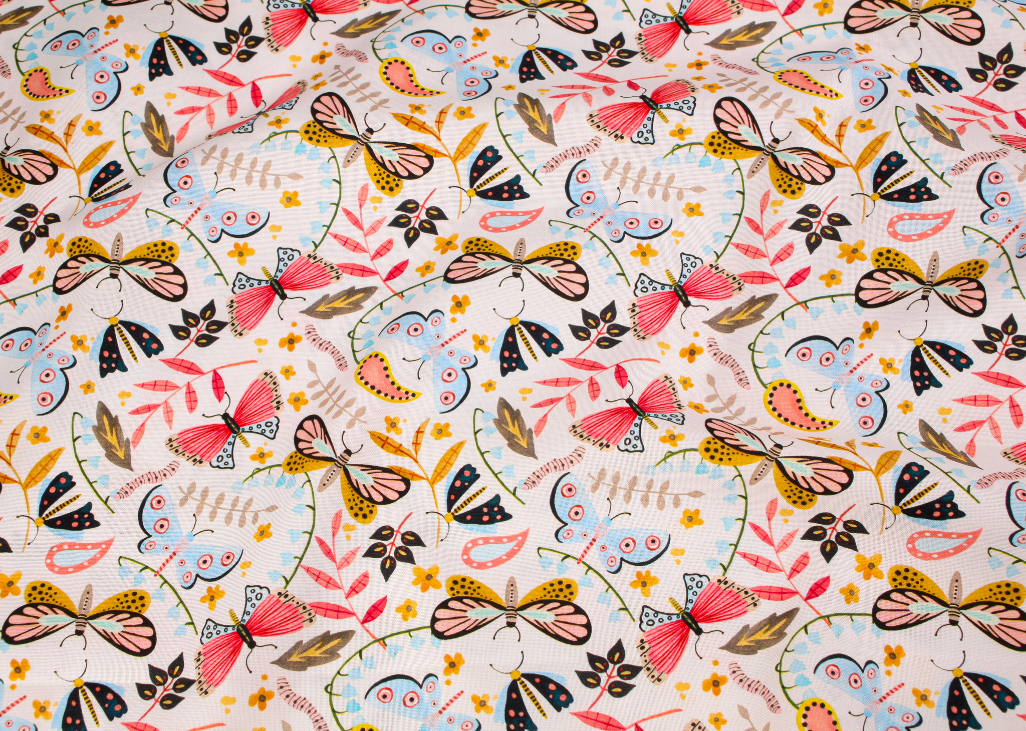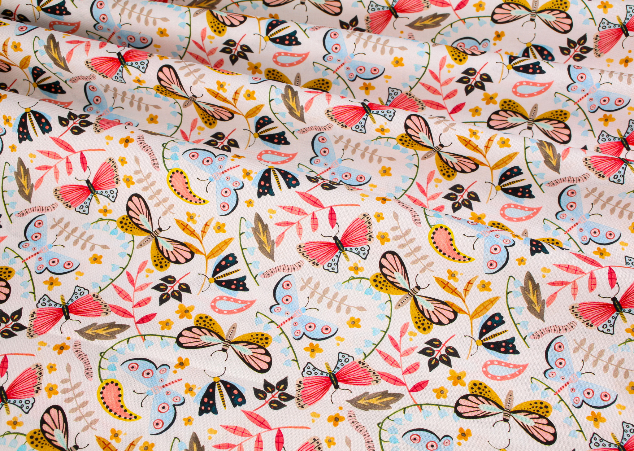 Blank Quilting Fabrics Nature’s Symphony – Butterflies and Caterpillars on White