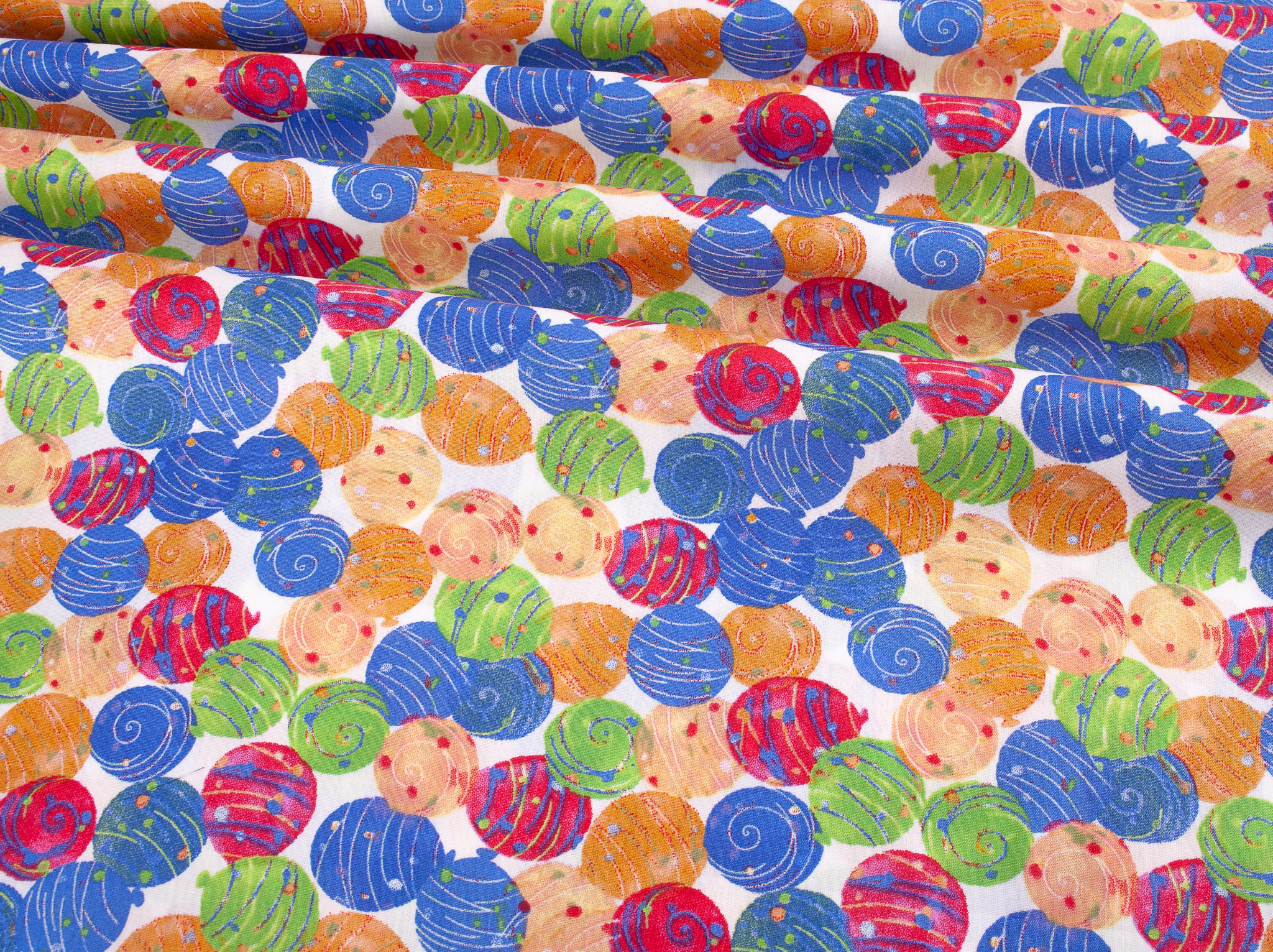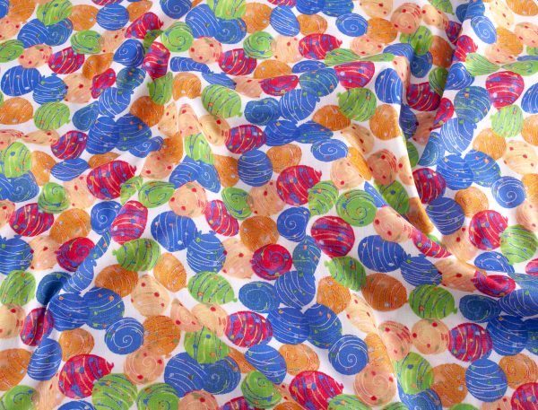A fun cotton lawn fabric featuring bright circles and confetti, perfect for blouses, shirts, skirts or dresses.