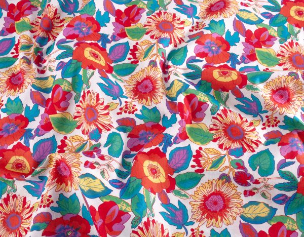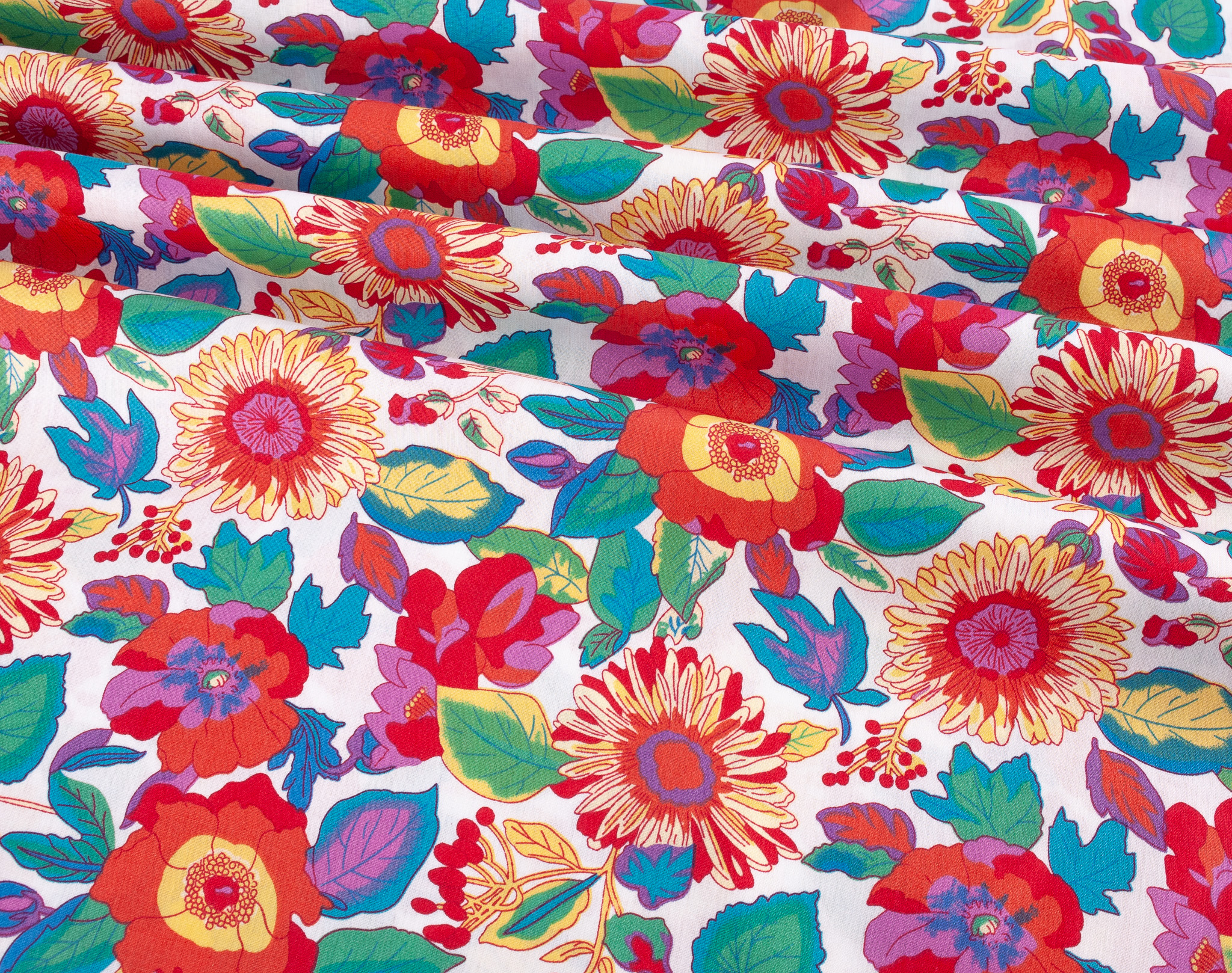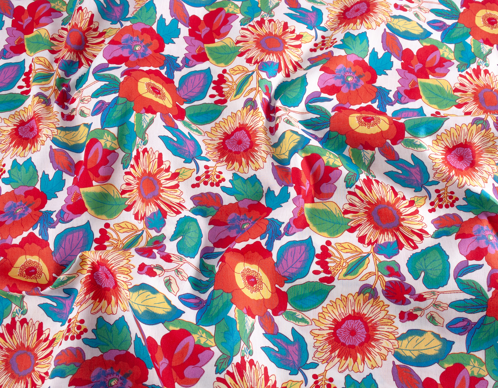 A vibrant floral cotton lawn, perfect for blouses, shirts, skirts or dresses.