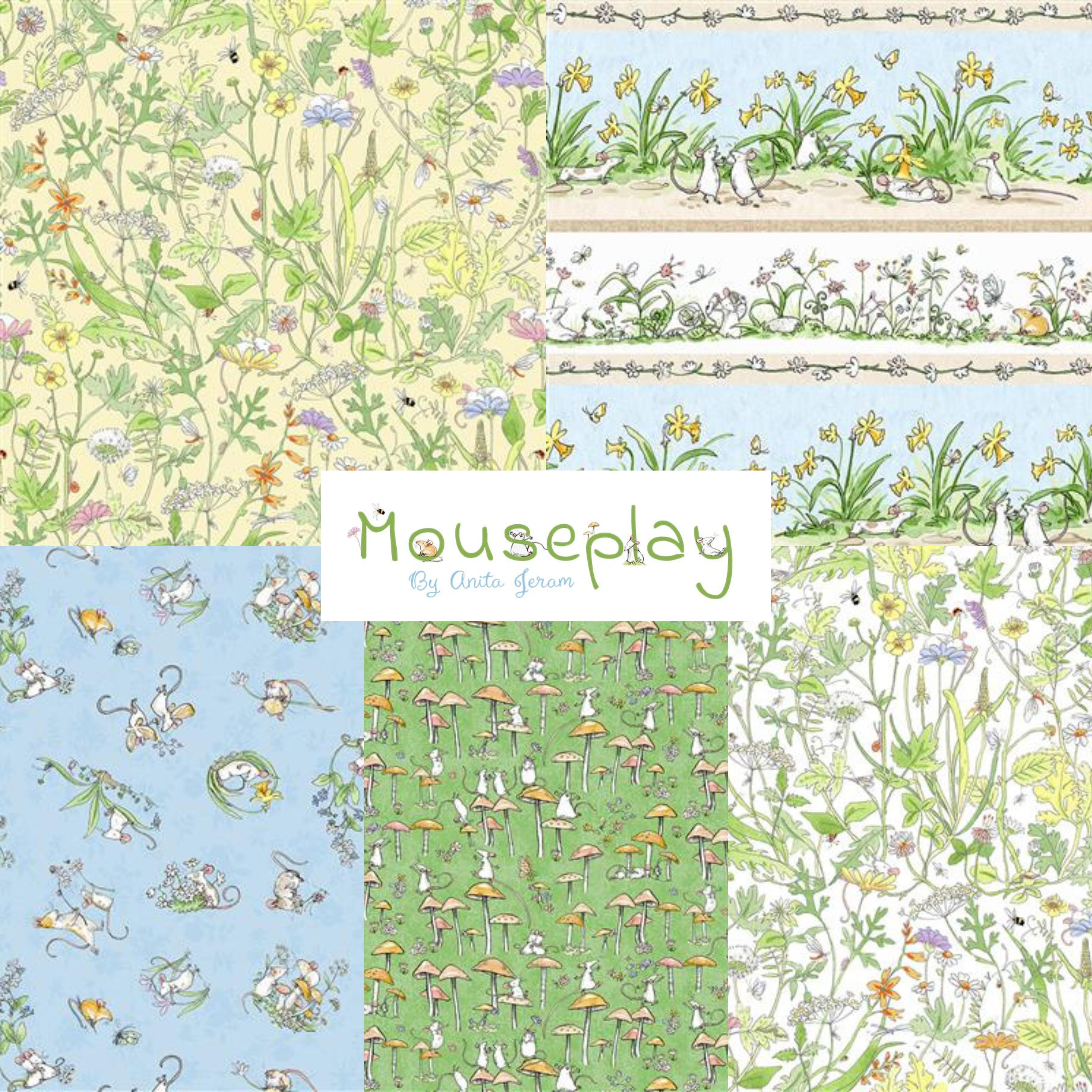 Mouseplay by Anita Jeram for Clothworks is a beautifully illustrated quilting cotton collection inspired by gentle woodland scenes and storybook charm