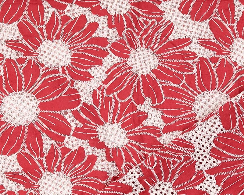 This beautifully detailed cotton fabric features an embroidered floral design that adds texture and decorative interest while maintaining a soft, breathable feel. The embroidery enhances the surface without affecting flexibility, making it easy to sew and comfortable to wear.