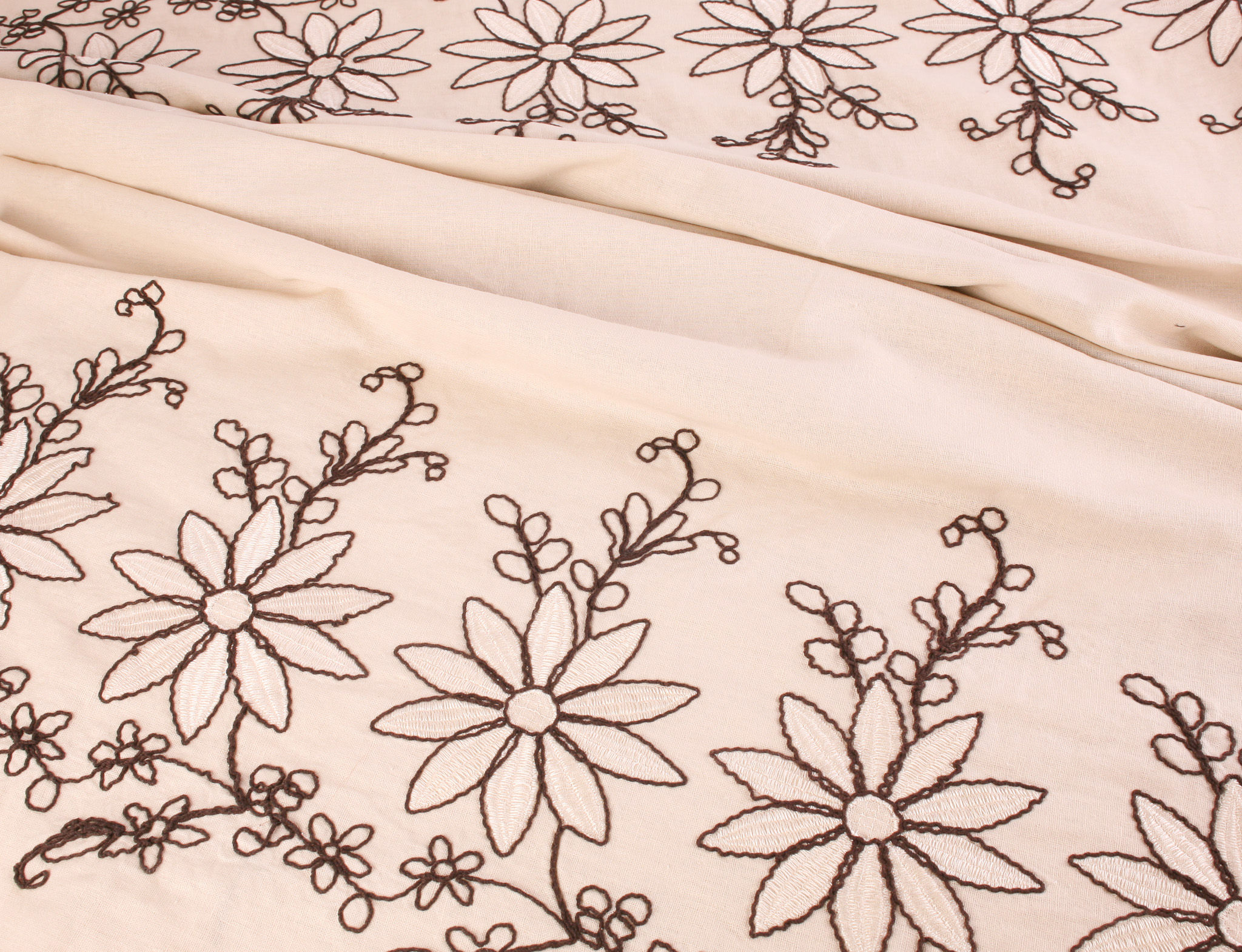 This beautiful deadstock linen features delicate floral embroidery with a striking double border design. The soft natural linen base is decorated with daisy-style flowers and trailing stems stitched in contrasting brown thread, creating a charming and timeless look.