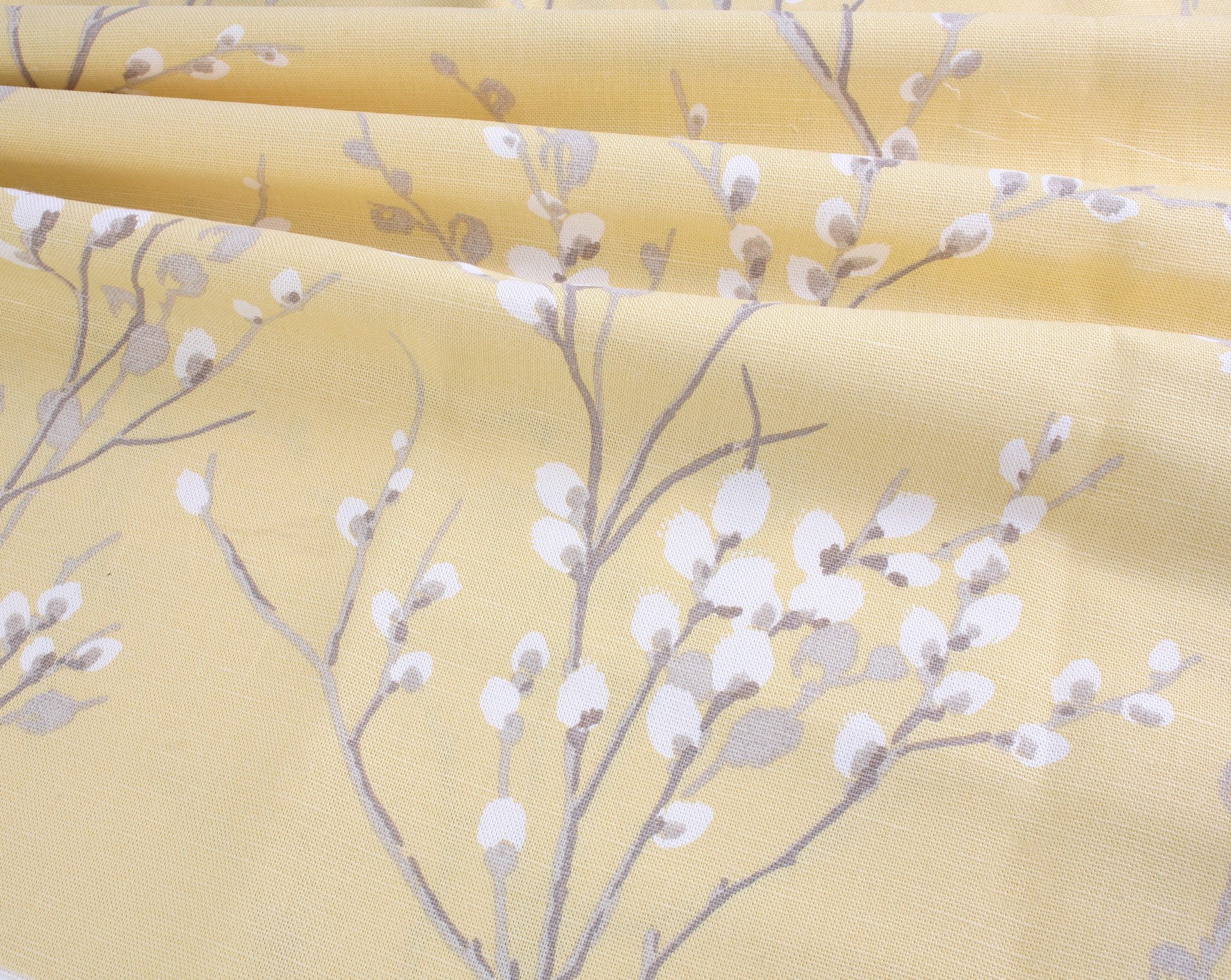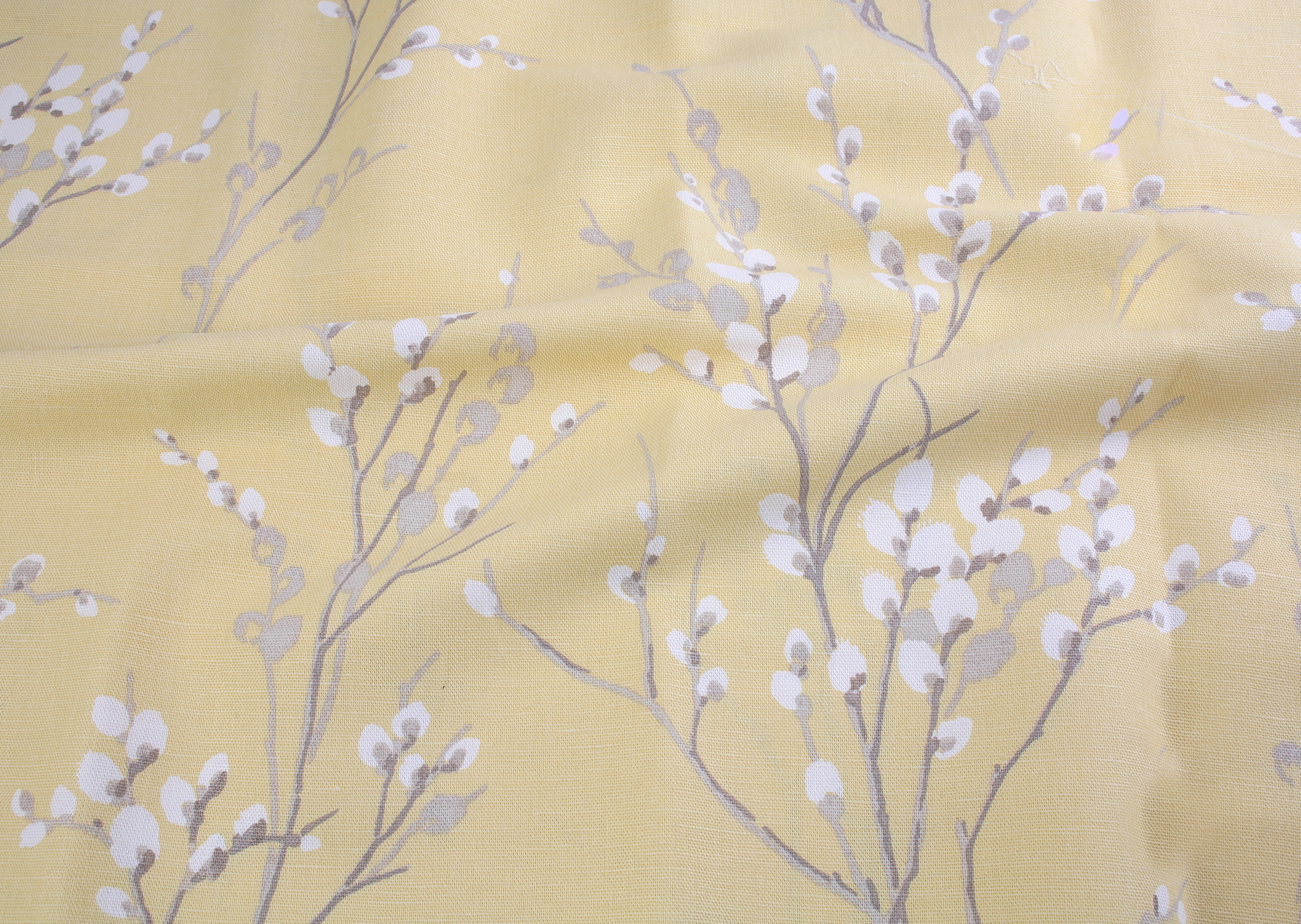 This charming canvas-weight cotton/linen blend features elegant trailing pussy willow branches on a soft yellow background, perfect for homeware and bagmaking. (large scale print)