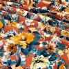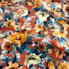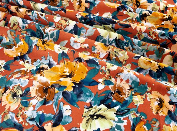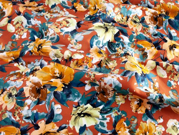 Green and brown flowers surrounded by leaves in different shades of blue on a rust-brown background
