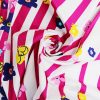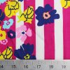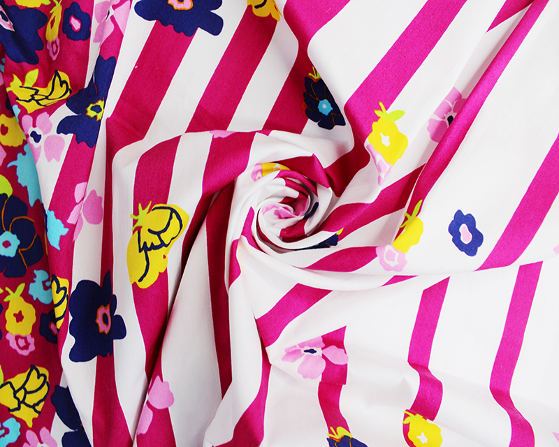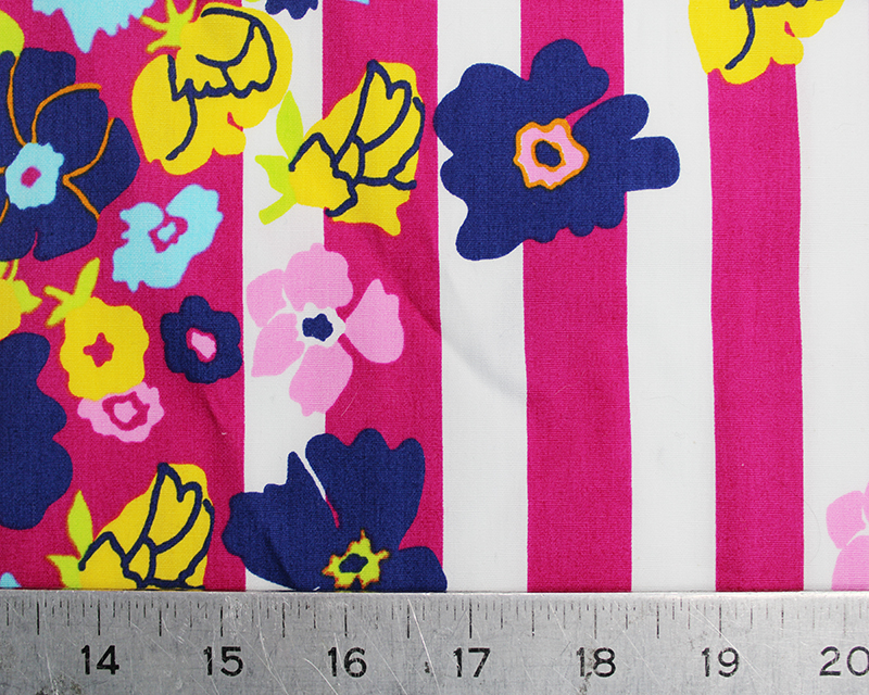 This fabric features white and pink vertical stripes that are detailed at the edges with a floral bouquet of summer flowers that wilt into the geometric striped section of the design.
