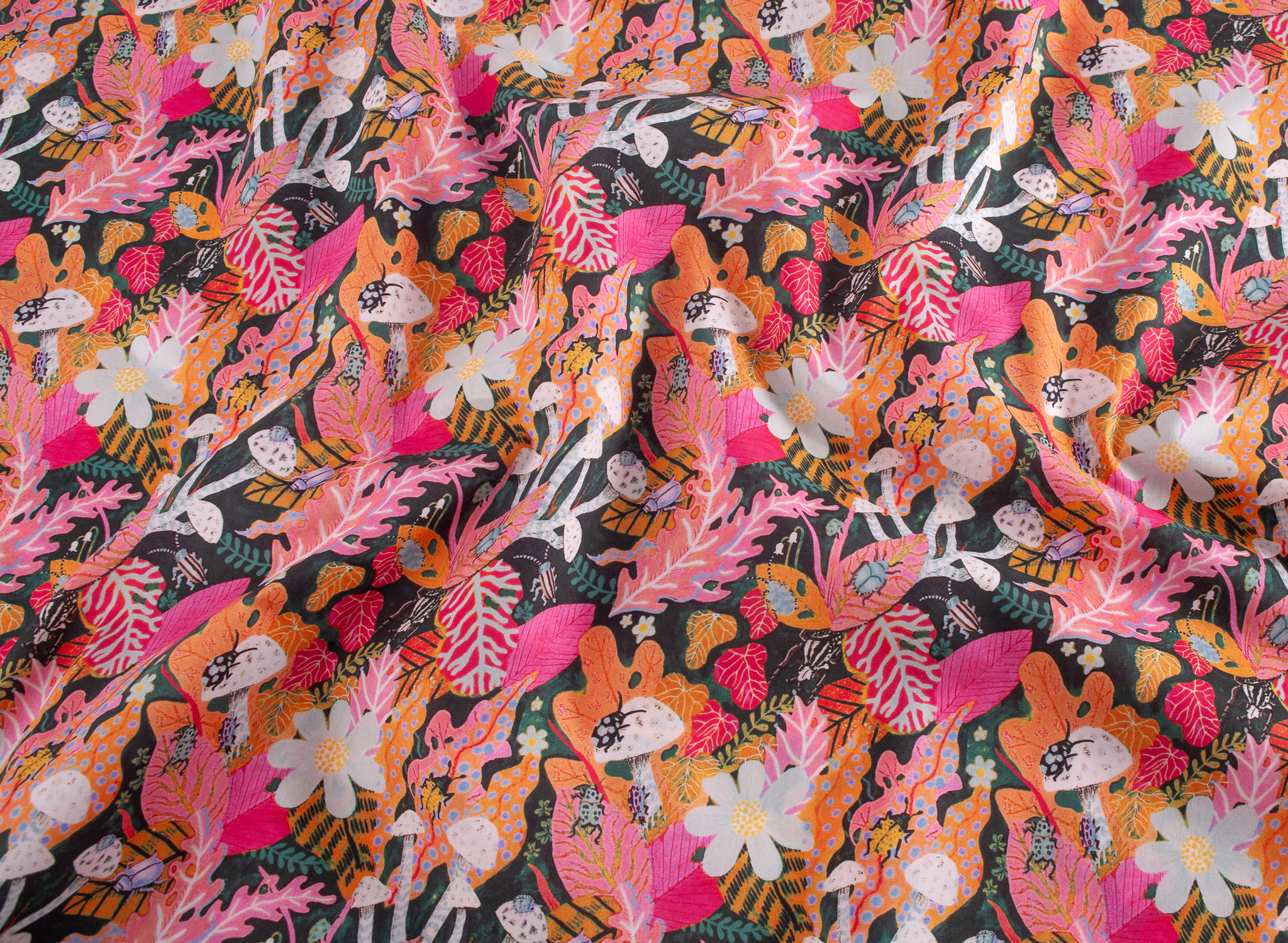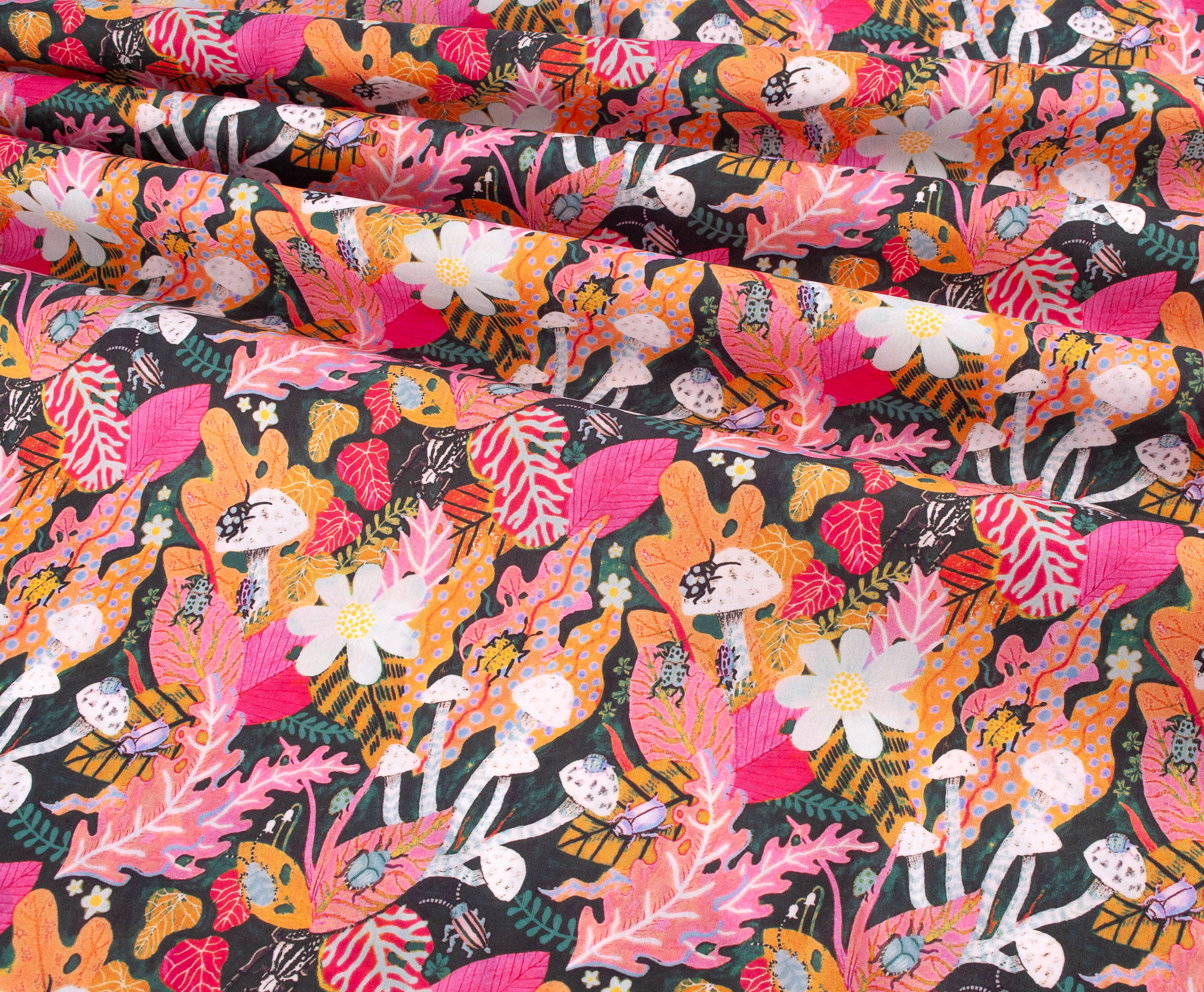 A print cotton lawn featuring mushroom, small bugs and bright leaves on a dark background, perfect for blouses, shirts, skirts or dresses.