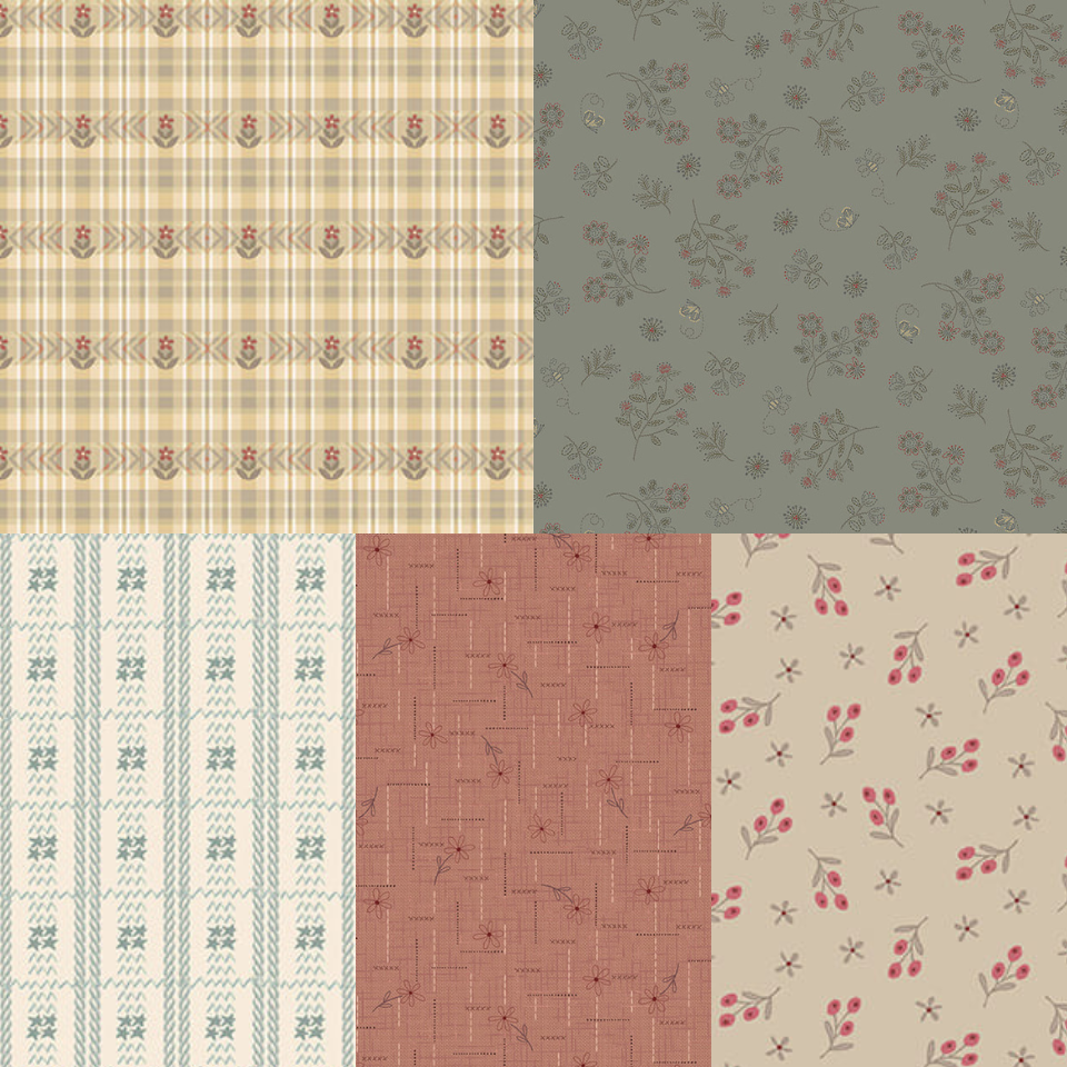 Simply Charming by Janet Rae Nesbitt is filled with ditsy patterns perfect for your home. The soft hued palette brings together dusty rose, sage green, and cream for a refined aesthetic. Many of the patterns feature motifs that have a stitched look giving them an artisan touch. This is a great group to bring subtle colours into your home space and be simply charmed by how well everything will coordinate.