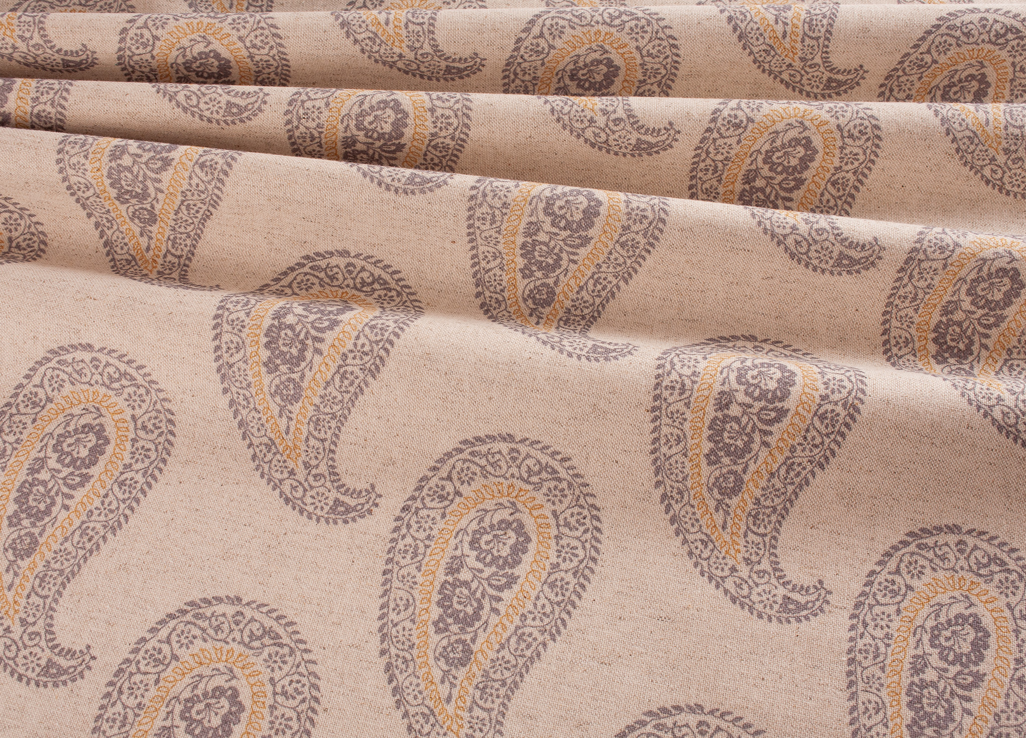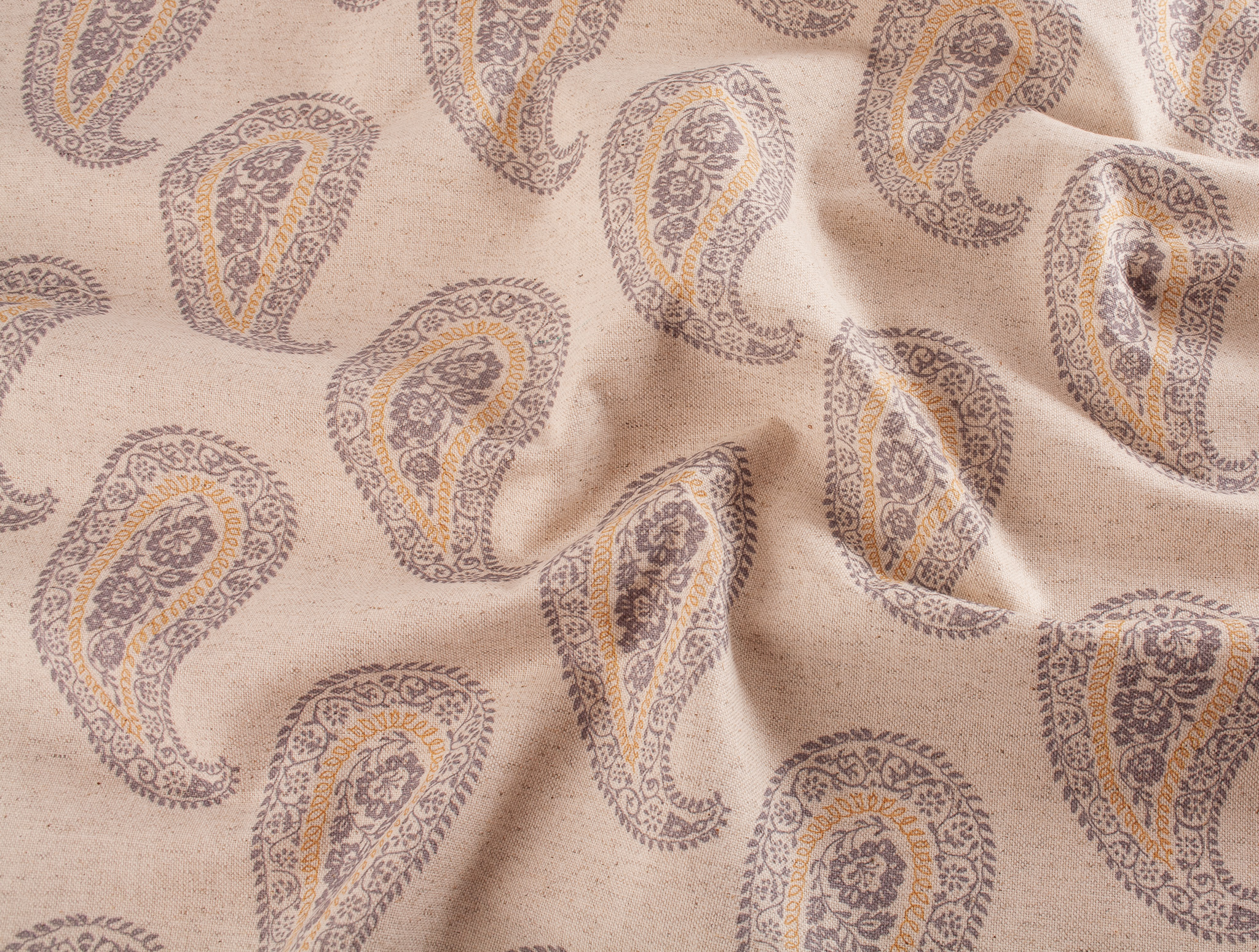 Large print paisley design on a natural, linen look background. An ideal fabric for curtains, blinds, home furnishings and bagmaking.