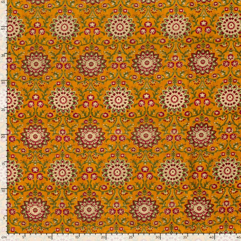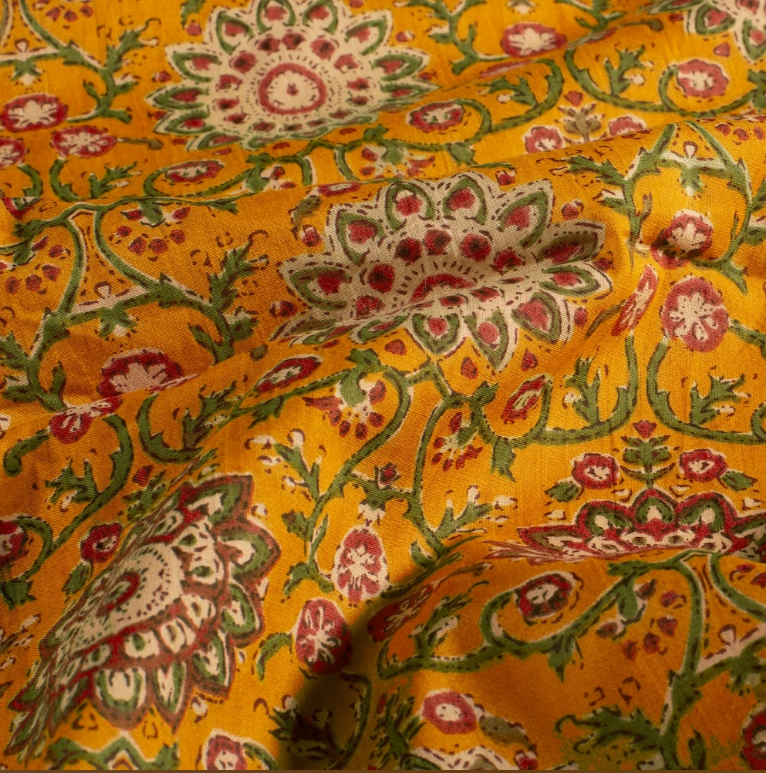 Modelo Fabrics – Green And Red On Ochre Floral Indian Block Print In Cotton