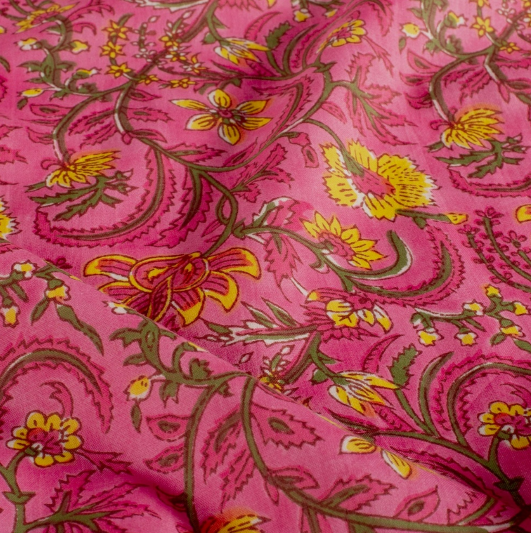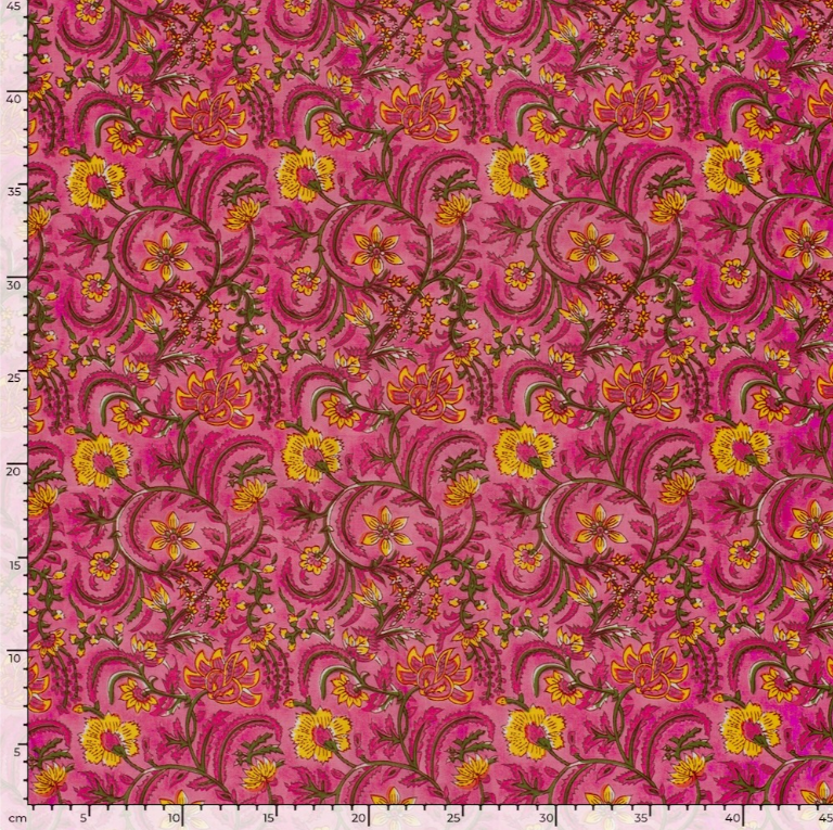 Modelo Fabrics – Yellow On Pink Floral Indian Block Print In Cotton