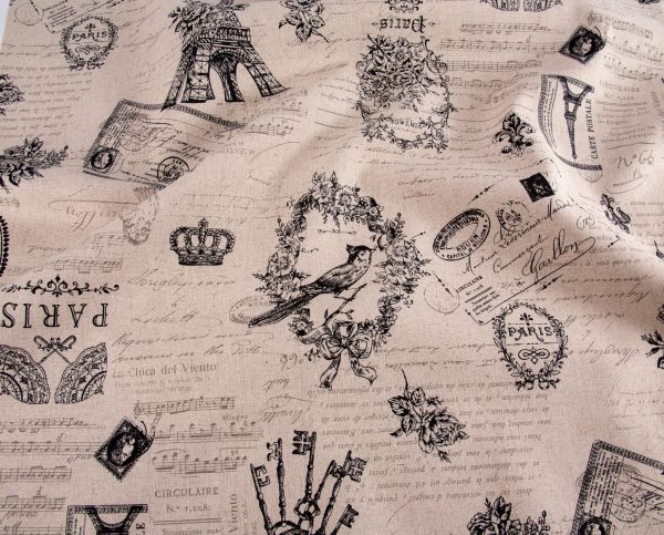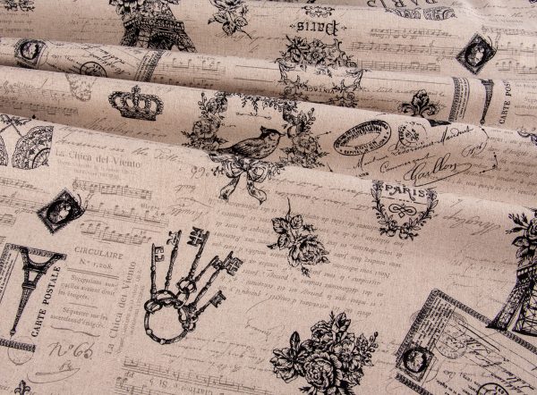 A cotton blend fabric featuring a larger scale Parisian design on musical notes on a linen textured background. A lovely fabric that resembles a lightweight canvas, perfect for bags, cushions and light upholstery.